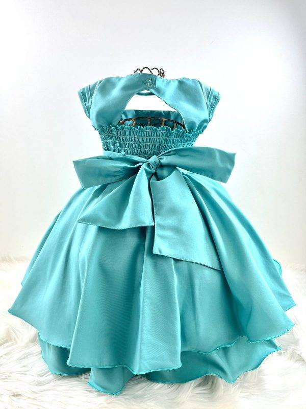 Vestido infantil manga curta com forro, peito quadriculado e pérolas sintéticas, saia lisa. Elástico nas costas ajustável ao corpo e laço.