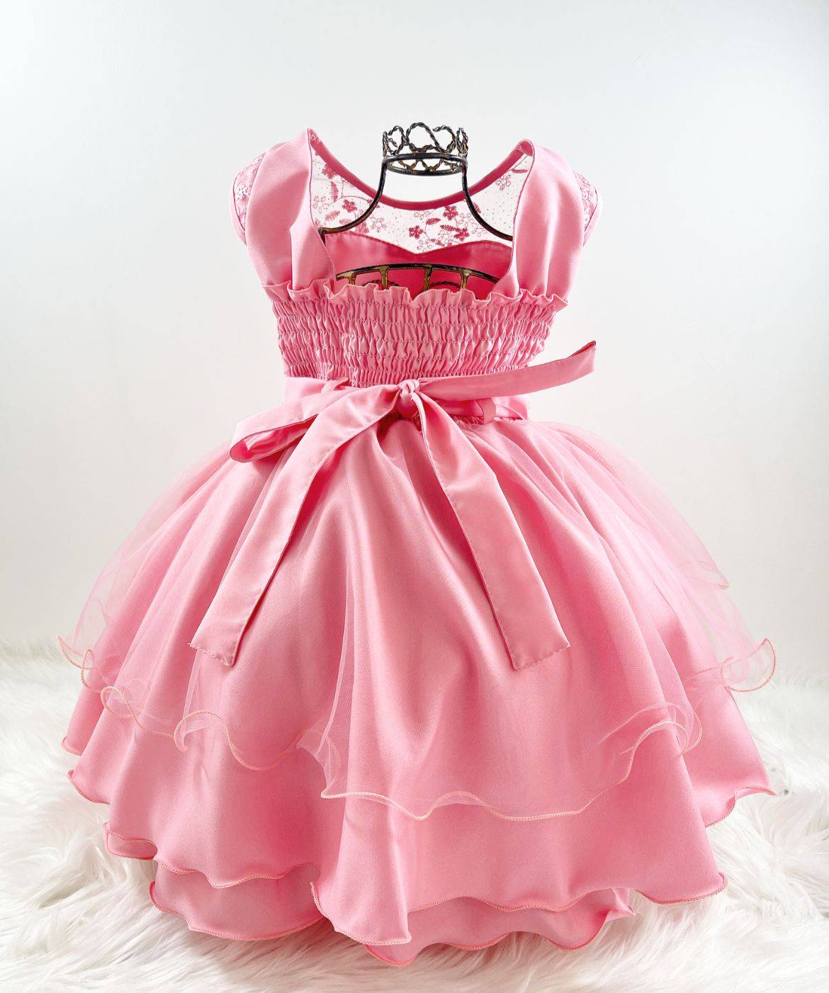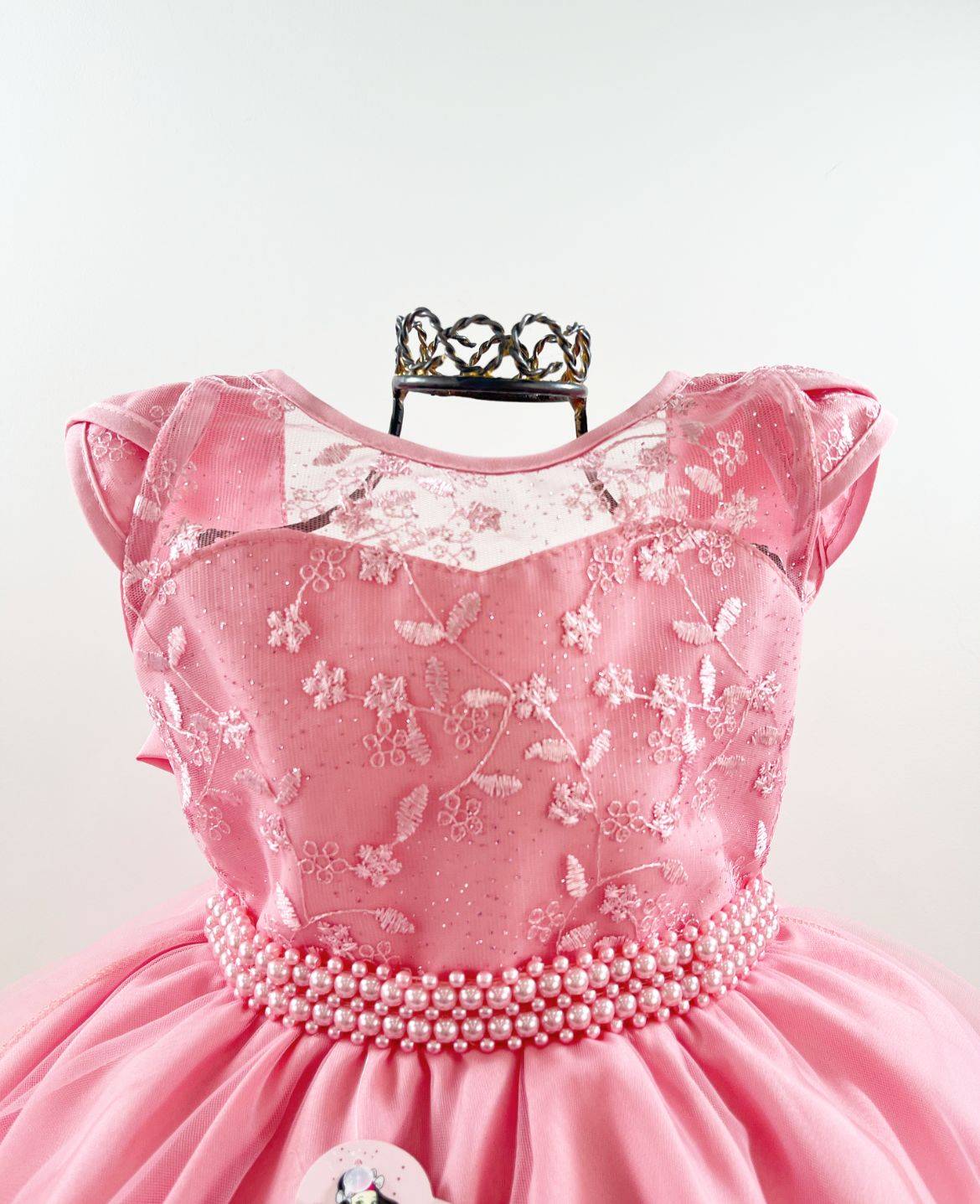 Vestido infantil manga curta, peito com renda, tule e detalhes de pérolas sintéticas, saia lisa . Cintura com pérolas sintéticas. Elástico nas costas ajustável ao corpo.