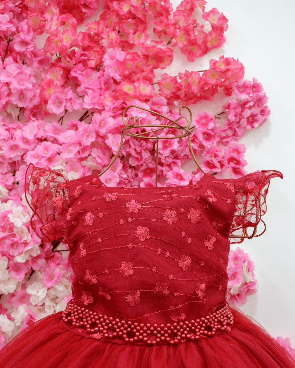 Vestido infantil Heloisa, modelo manga curta, detalhes em seu peito em renda, saia em tule.