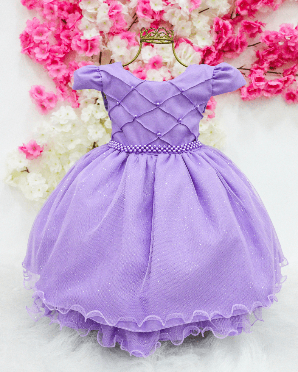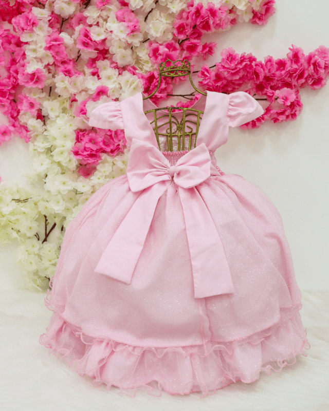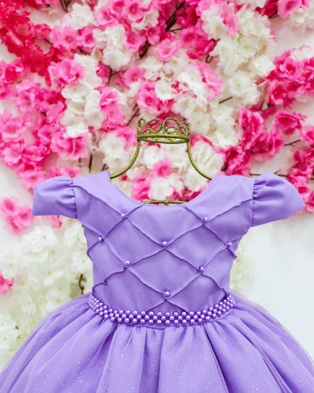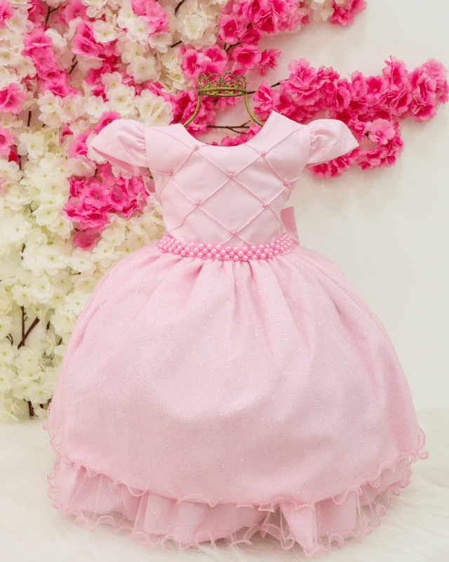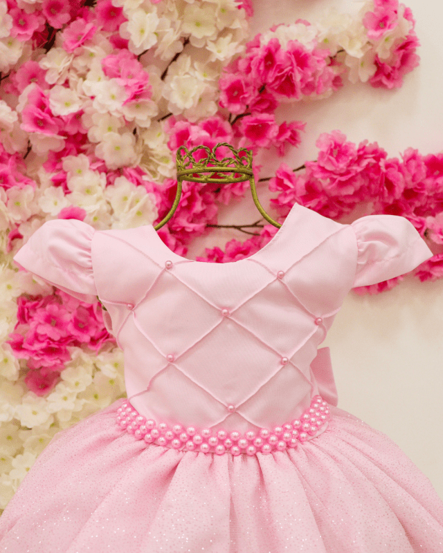 Vestido infantil Kadmia, modelo manga curta, detalhes em seu peito em pérolas, saia em tule.