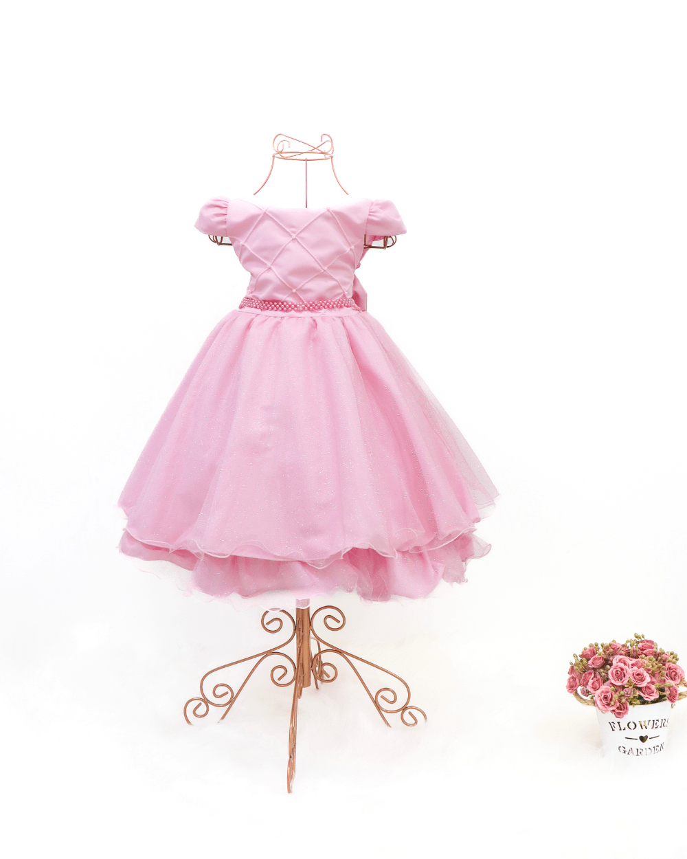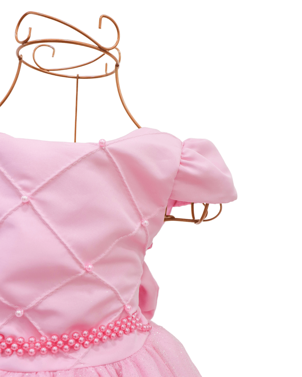 VESTIDO MANGA CURTA COM FORRO, PEITO QUADRICULADO, CINTURA COM PÉROLAS SINTÉTICAS , SAIA TULE COM GLITTER, LAÇO E ELÁSTICO NAS COSTAS AJUSTÁVEL AO CORPO.