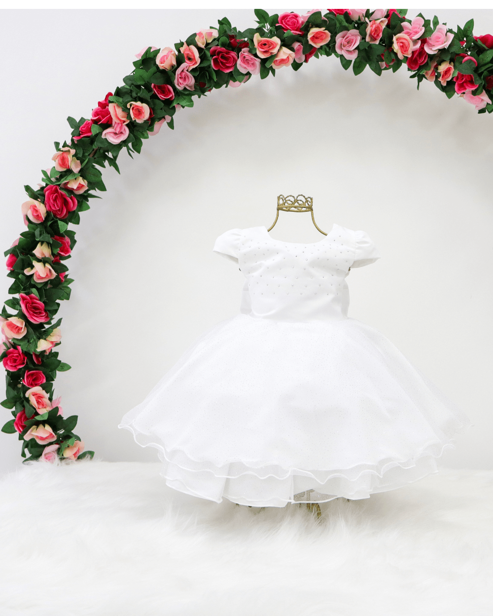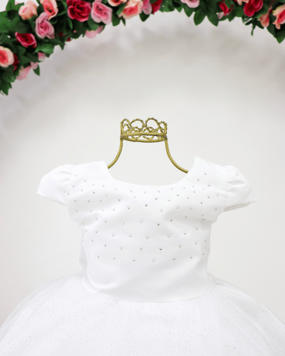 Vestido infantil manga curta, peito com aplicações strass, saia lisa de tule com brilho, elástico nas costas ajustável ao corpo.