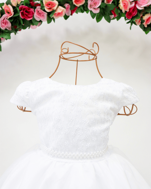 VESTIDO MANGA CURTA COM FORRO, PEITO RENDADO, CINTURA COM PÉROLAS SINTÉTICAS , SAIA DE TULE, LAÇO E ELÁSTICO NAS COSTAS AJUSTÁVEL AO CORPO.