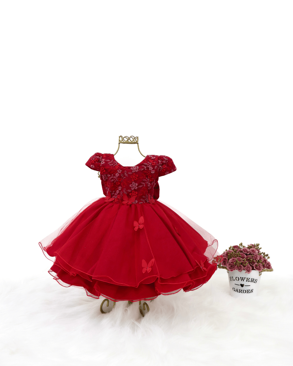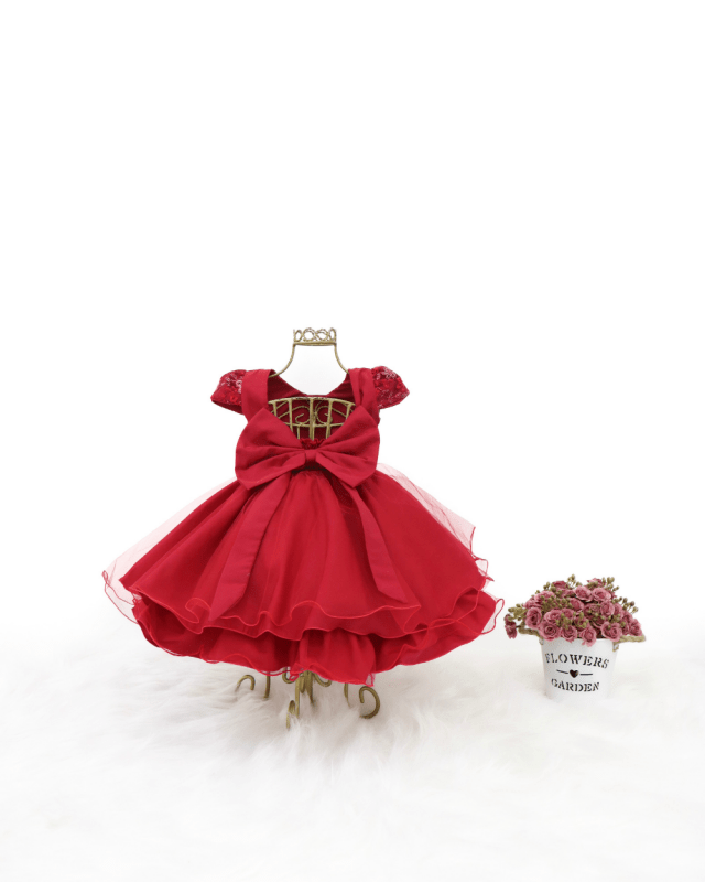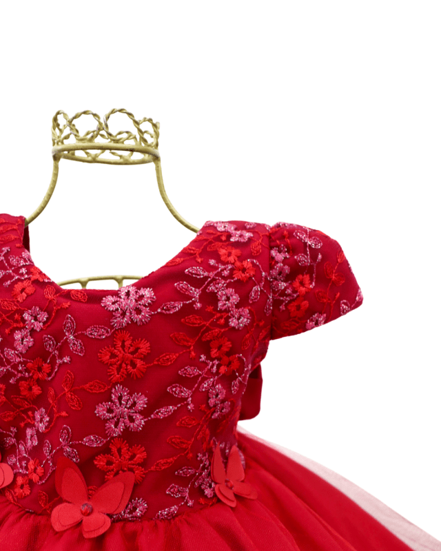 Vestido infantil manga curta, peito com renda e pérolas sintéticas. Cintura bordada com pérolas sintéticas, saia lisa com uma camada de tule com apliques de borboletas, elástico nas costas ajustável ao corpo.