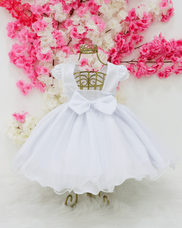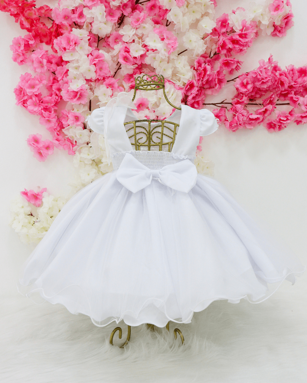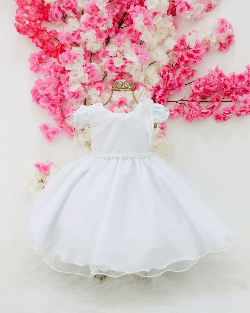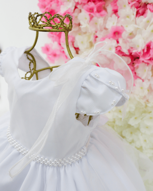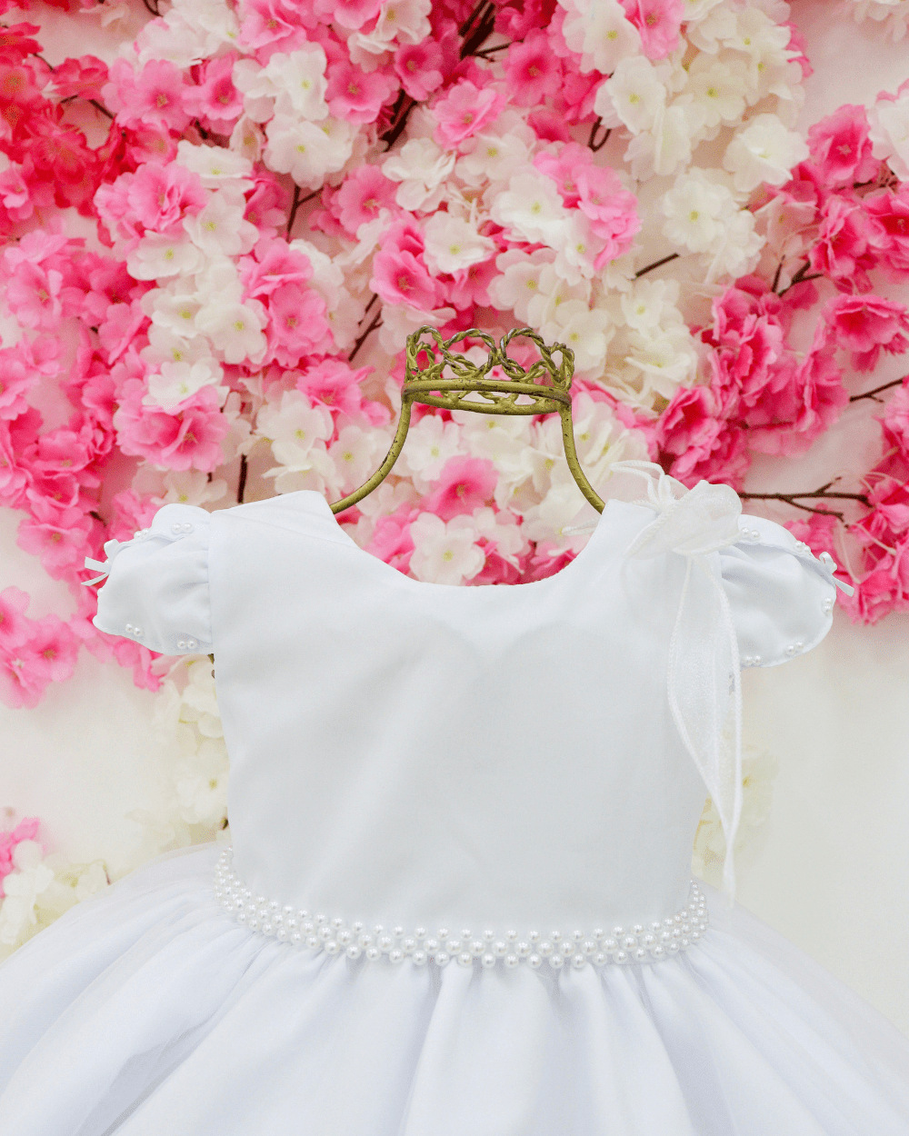 Vestido caracoles, manga curta branco, com golinha bordada super delicado saia em tule, cinto de pérolas e costa elástica para melhor ajuste ao corpo.