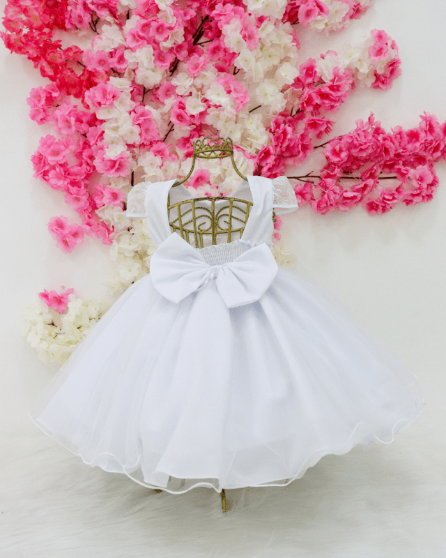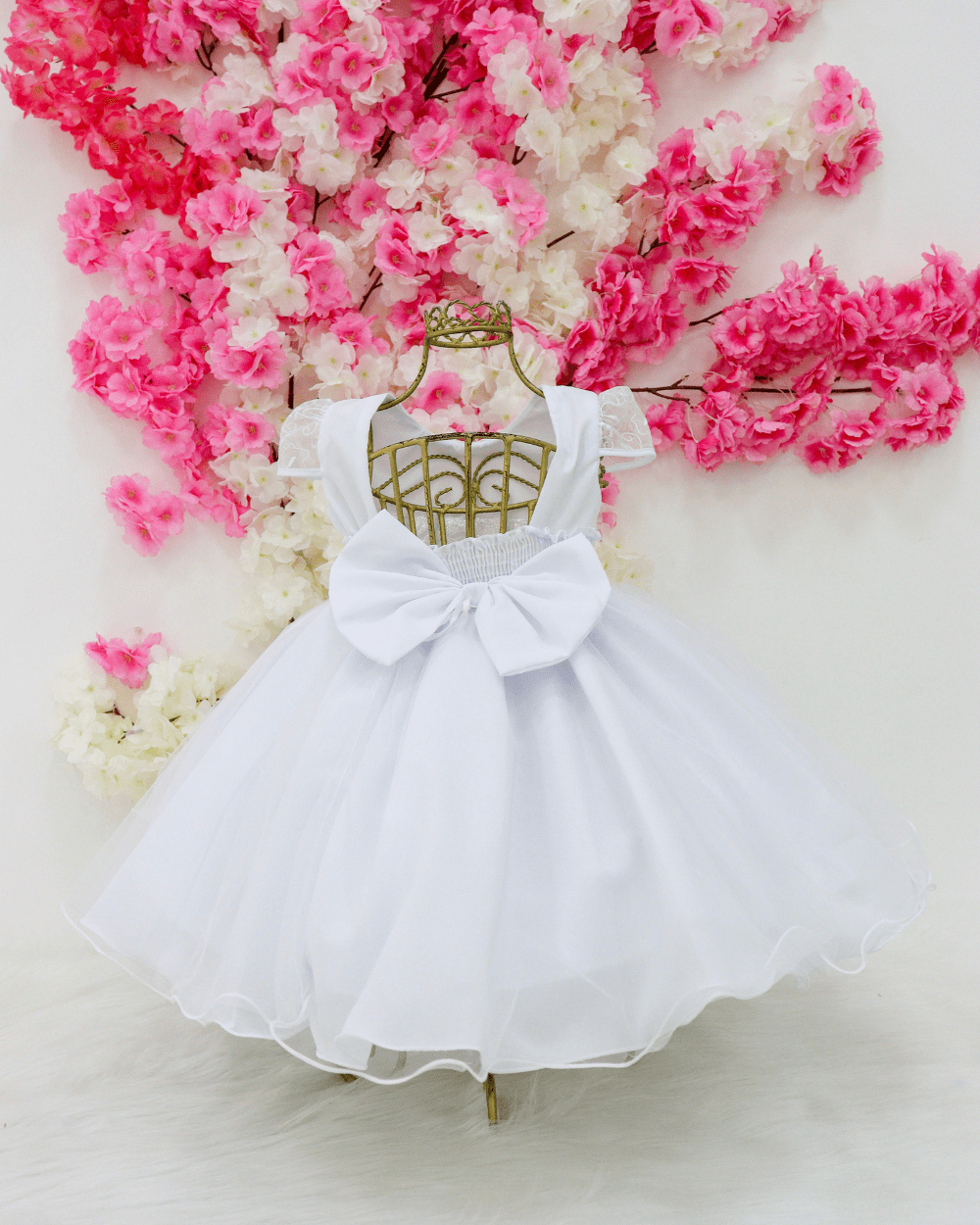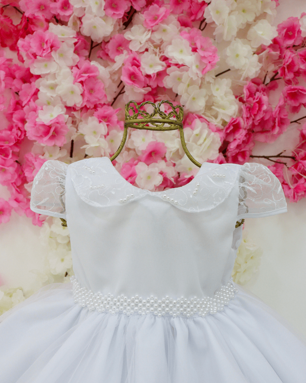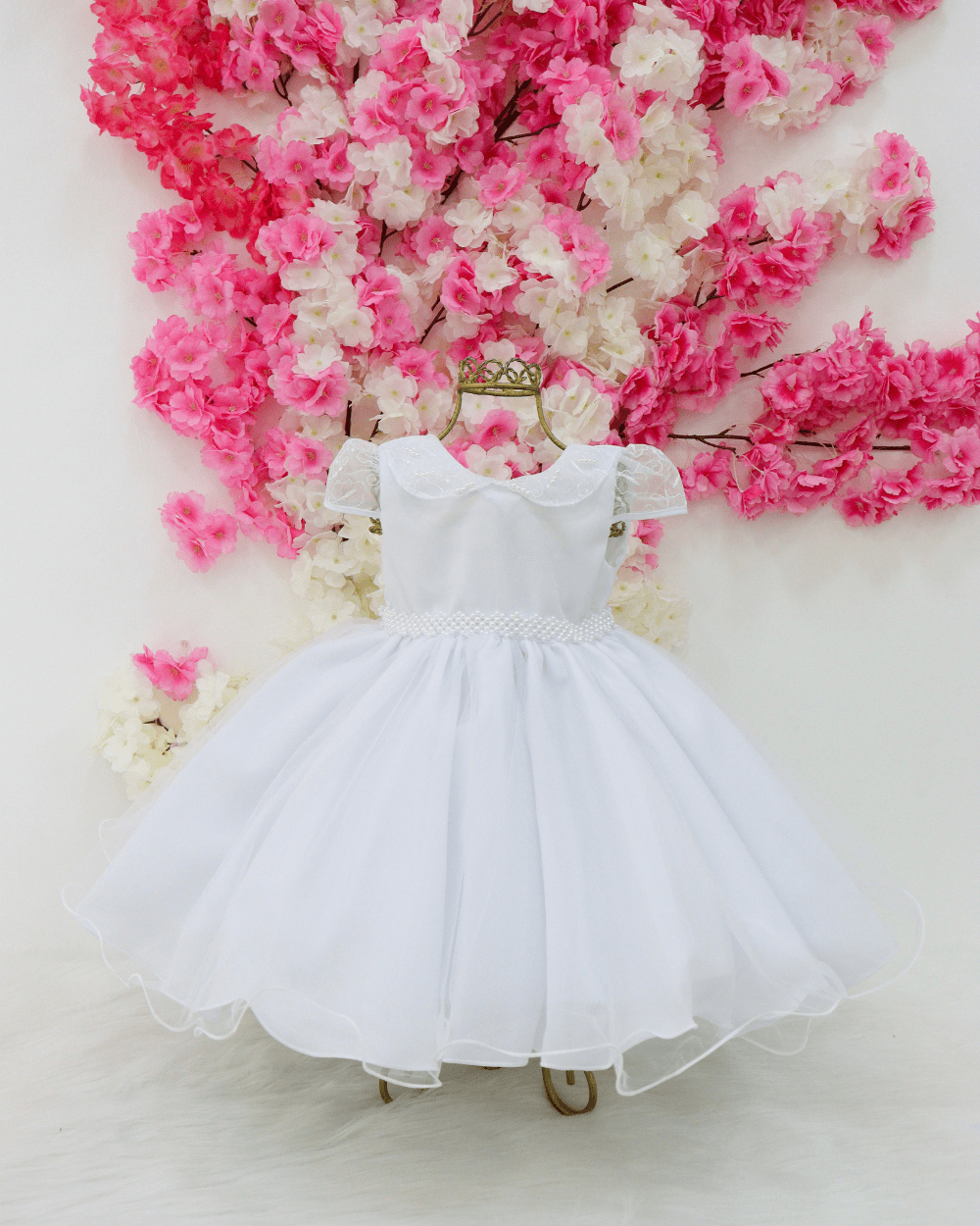 Vestido caracoles, manga curta branco, com golinha bordada super delicado saia em tule, cinto de pérolas e costa elástica para melhor ajuste ao corpo.