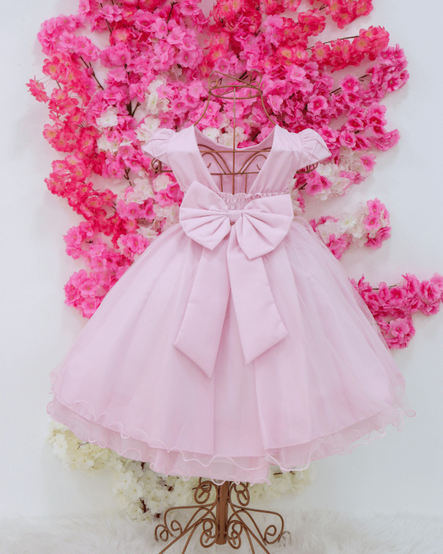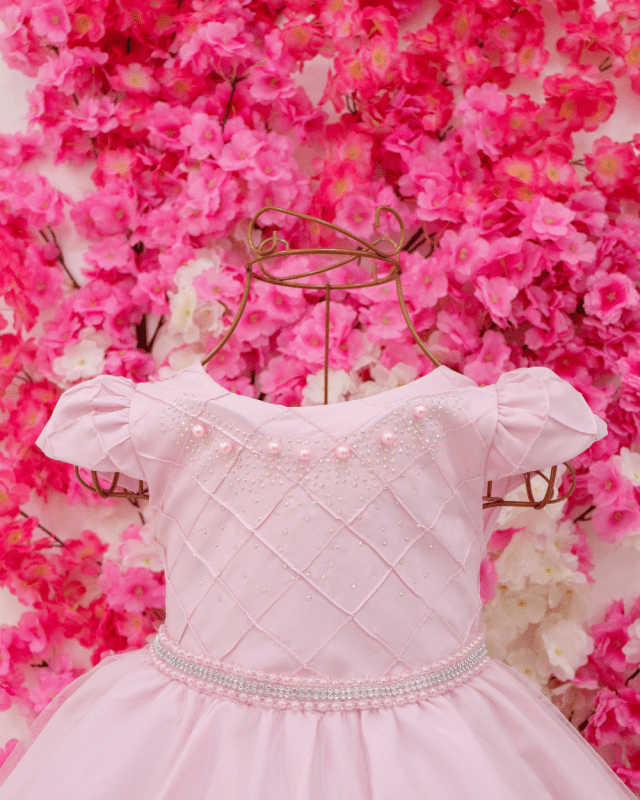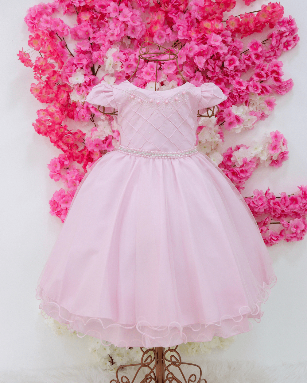 Vestido infantil manga curta, peito rendado com aplicações de flores. Cintura com aplicações de flores, saia lisa com tule de brilho, contém elástico atrás para melhor ajuste ao corpo.