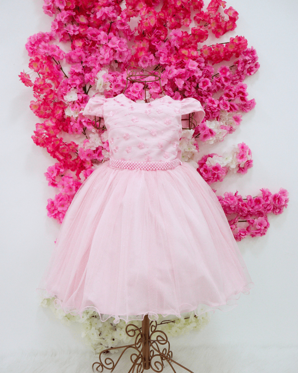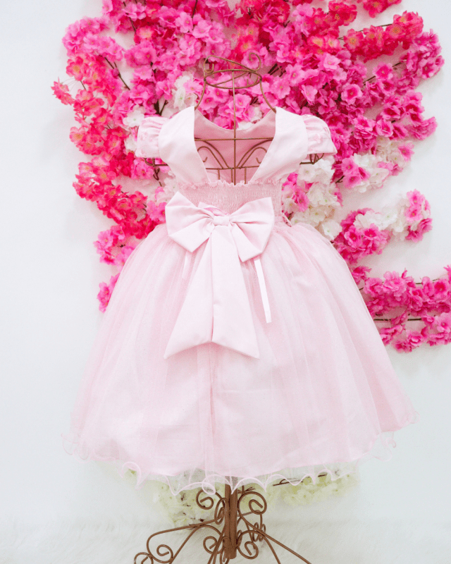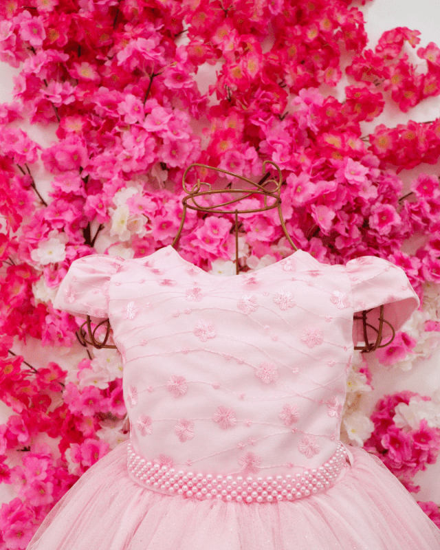 Vestido Heloisa, manga curta rosa, com peito rendado super delicado saia em tule, cinto de pérolas e costa elástica para melhor ajuste ao corpo.
