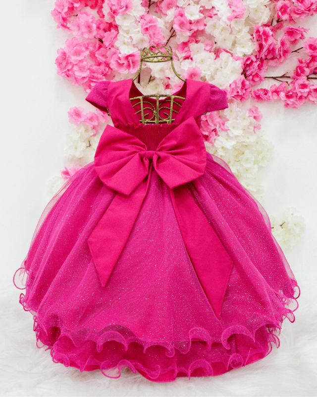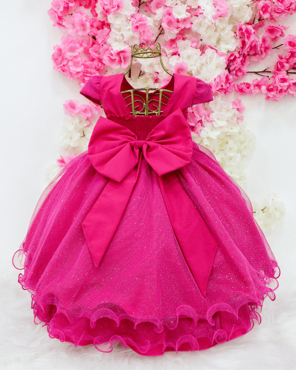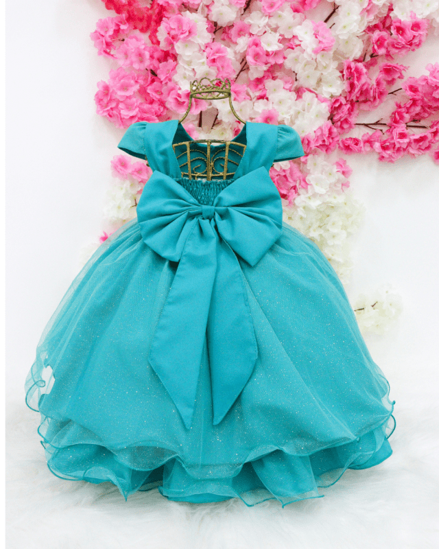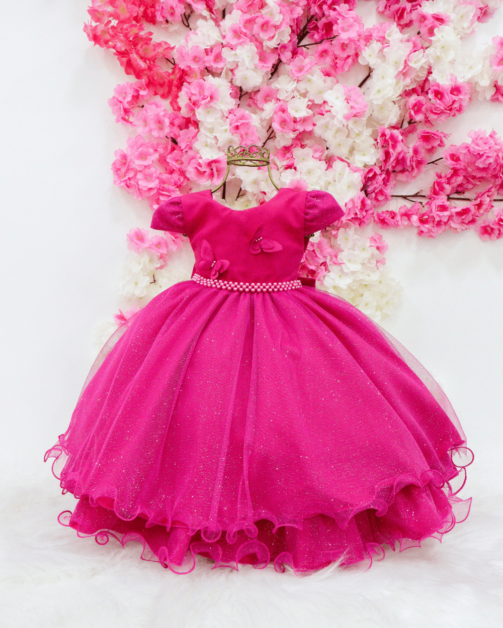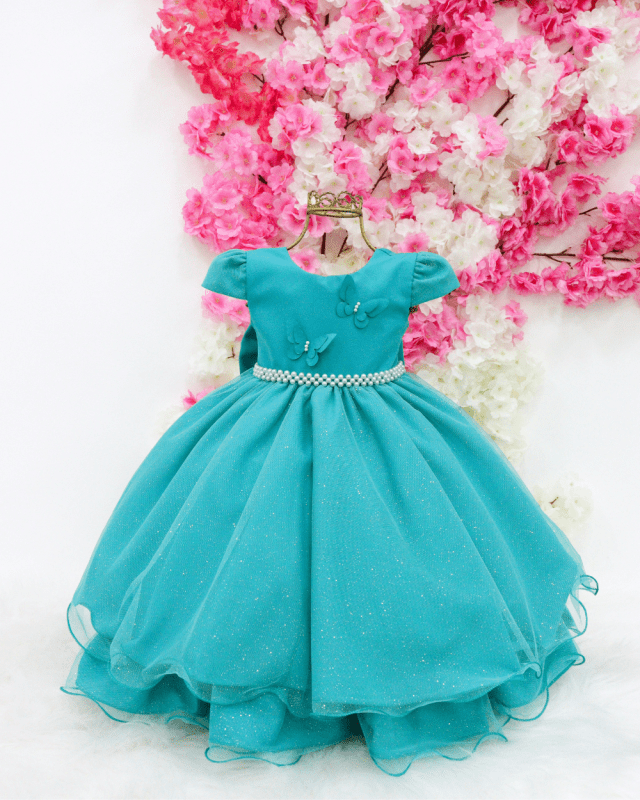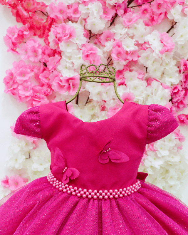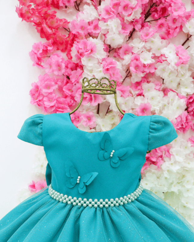 Vestido, manga curta, com peito com borboletas aplicadas super delicado saia em tule, cinto de pérolas e costa elástica para melhor ajuste ao corpo.