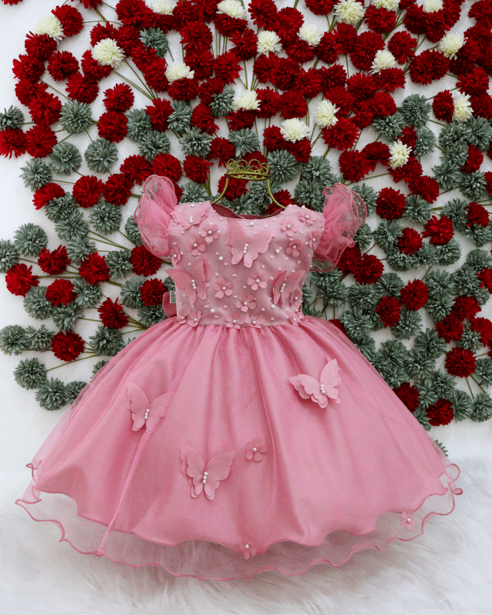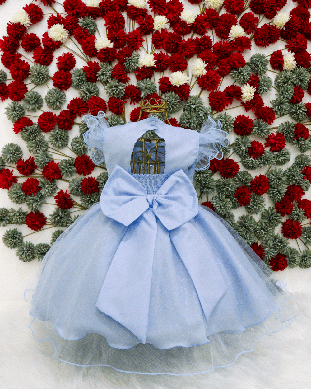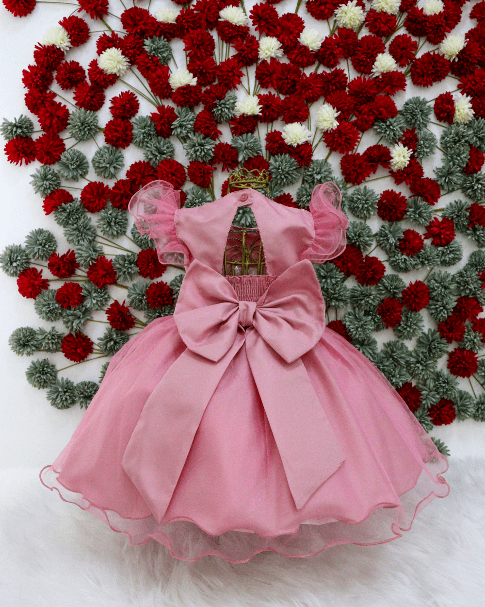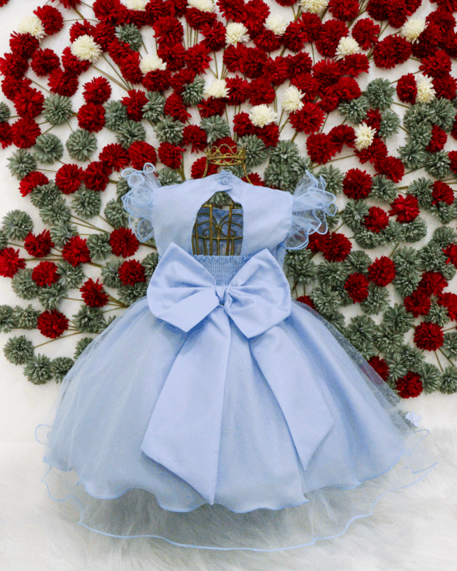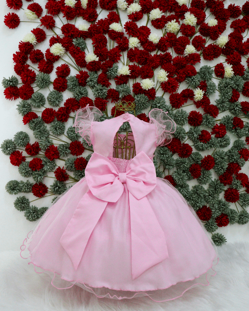 Vestido, manga curta, com detalhes no peito super delicado saia em tule e costa elástica para melhor ajuste ao corpo.