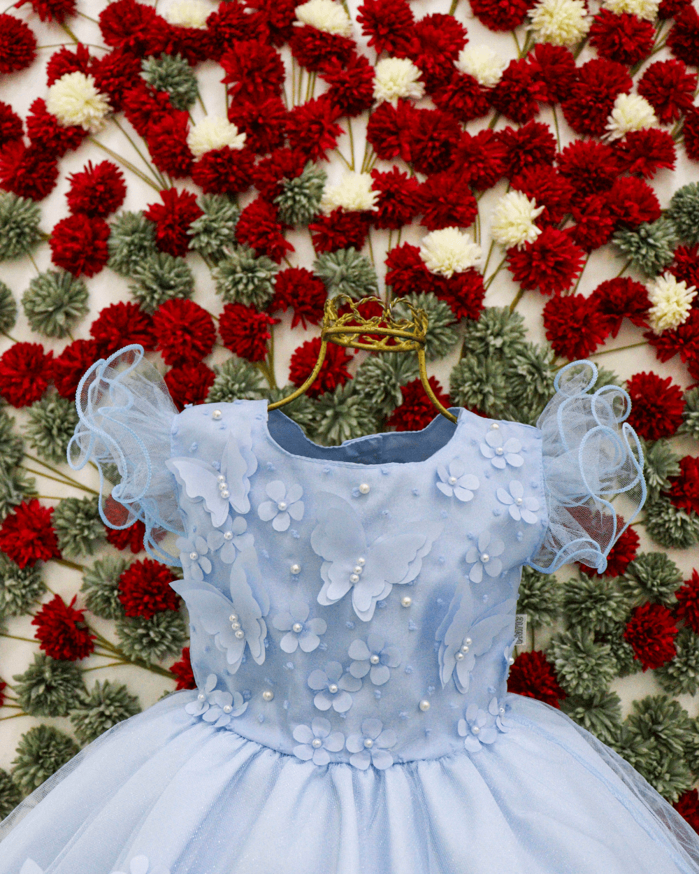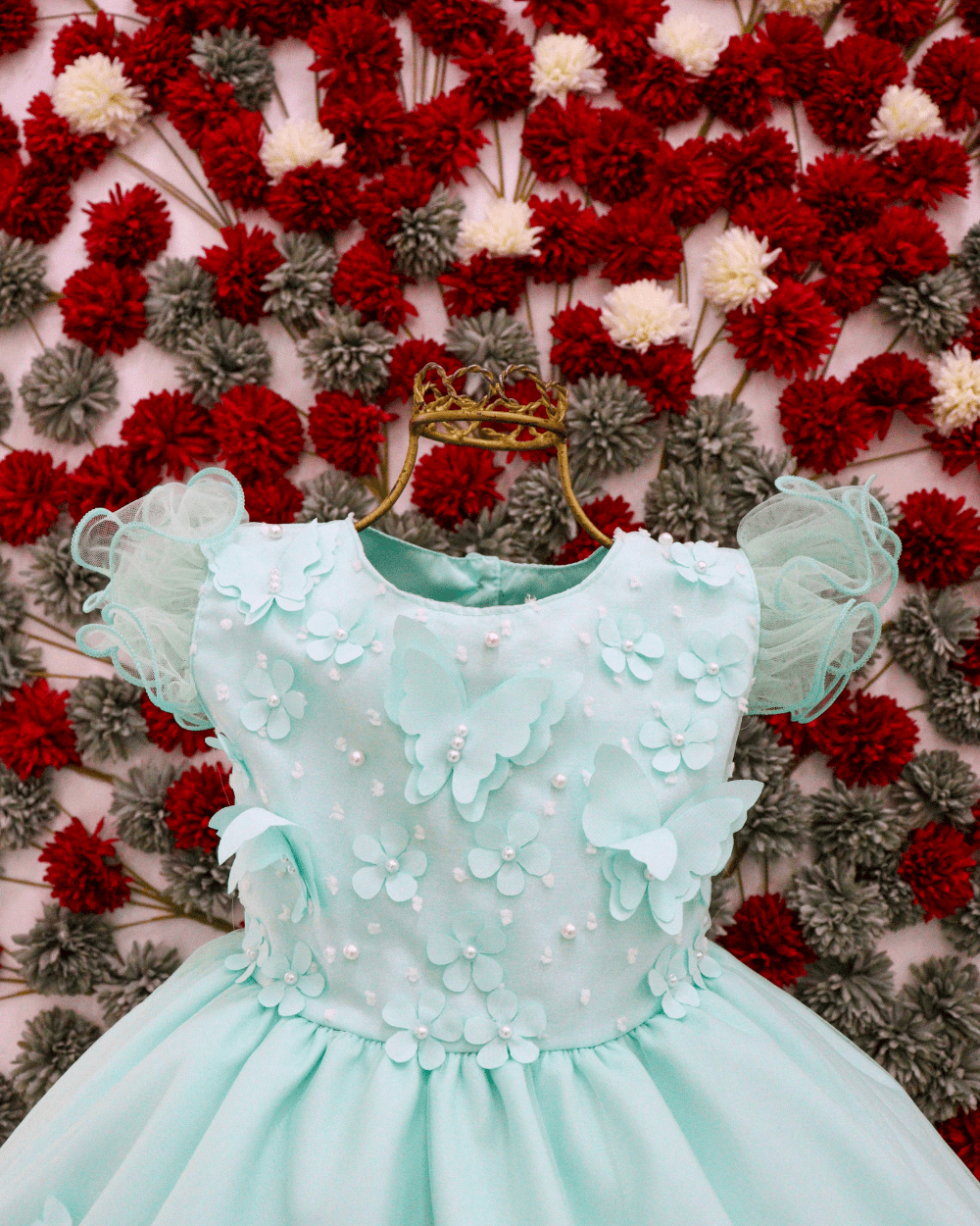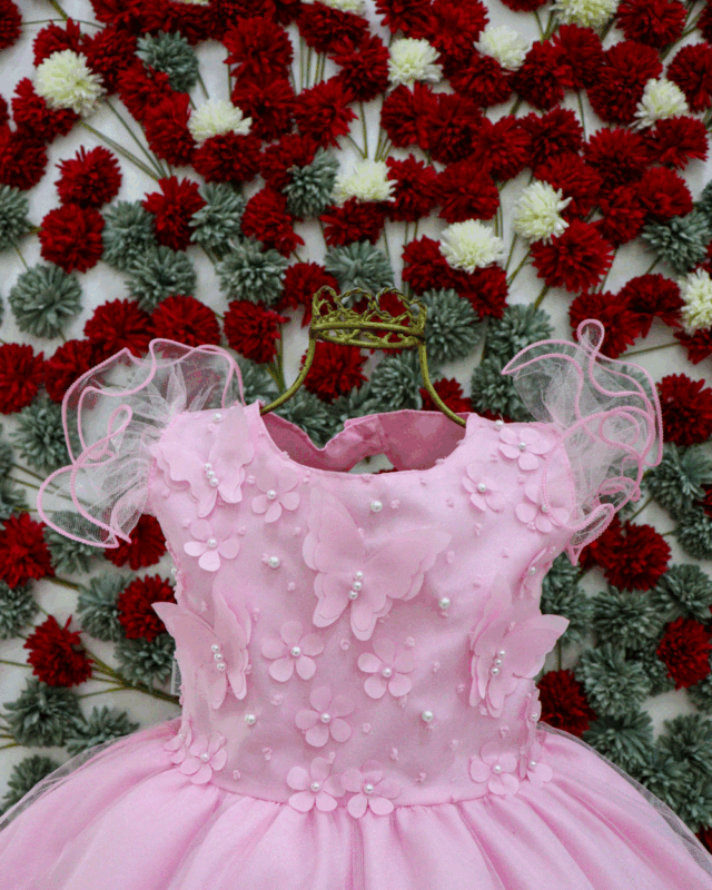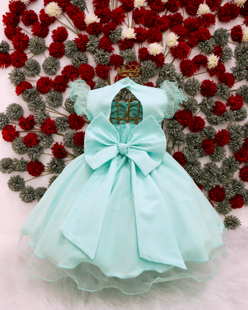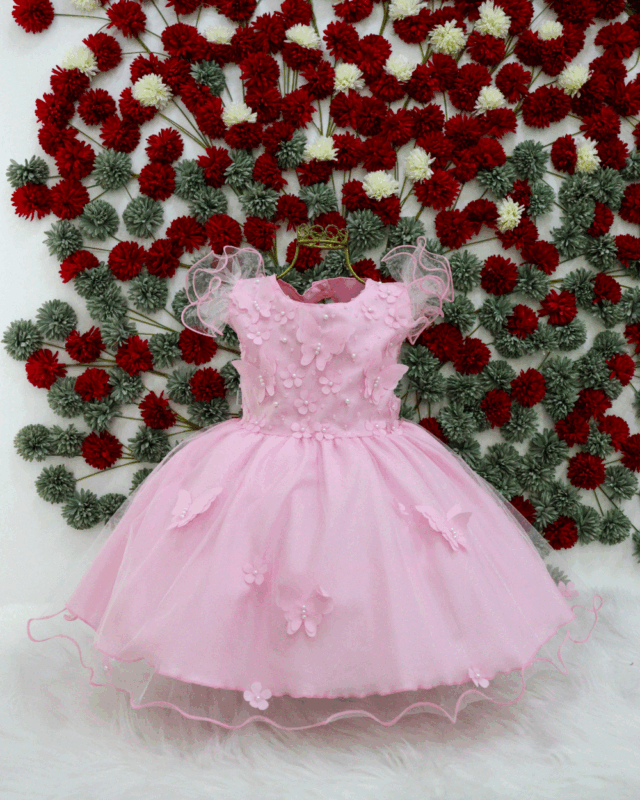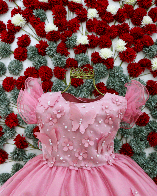 Vestido, manga curta, com detalhes no peito super delicado saia em tule e costa elástica para melhor ajuste ao corpo.