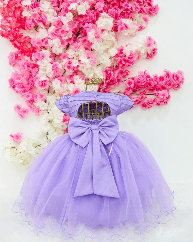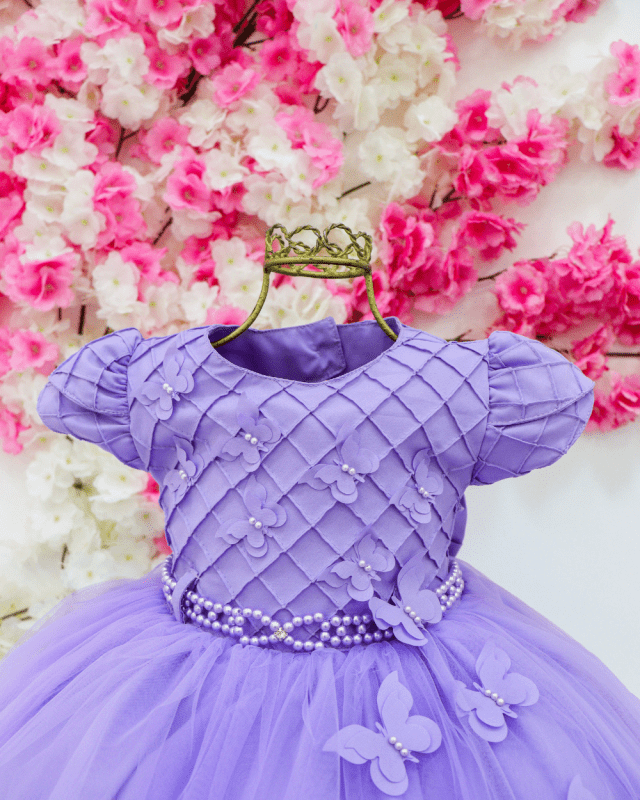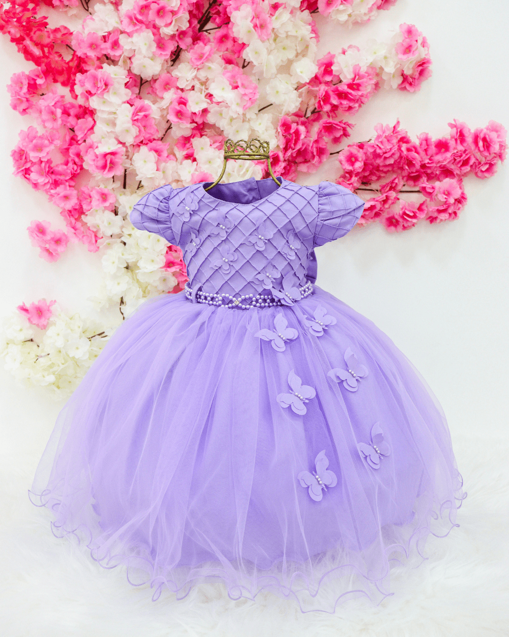 Vestido Menina Bonita, vestido manga curta com cinto de pérolas, peito em tule de poa aplicações em strass, costas semi aberta e laço removível.