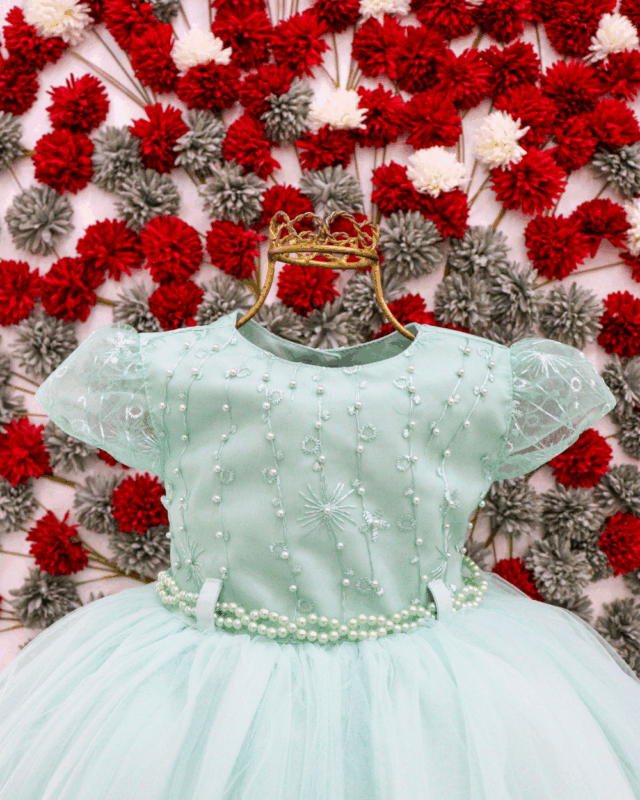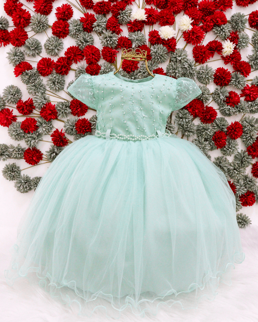 Vestido, manga curta, com detalhes no peito super delicado saia em tule e costa elástica para melhor ajuste ao corpo.