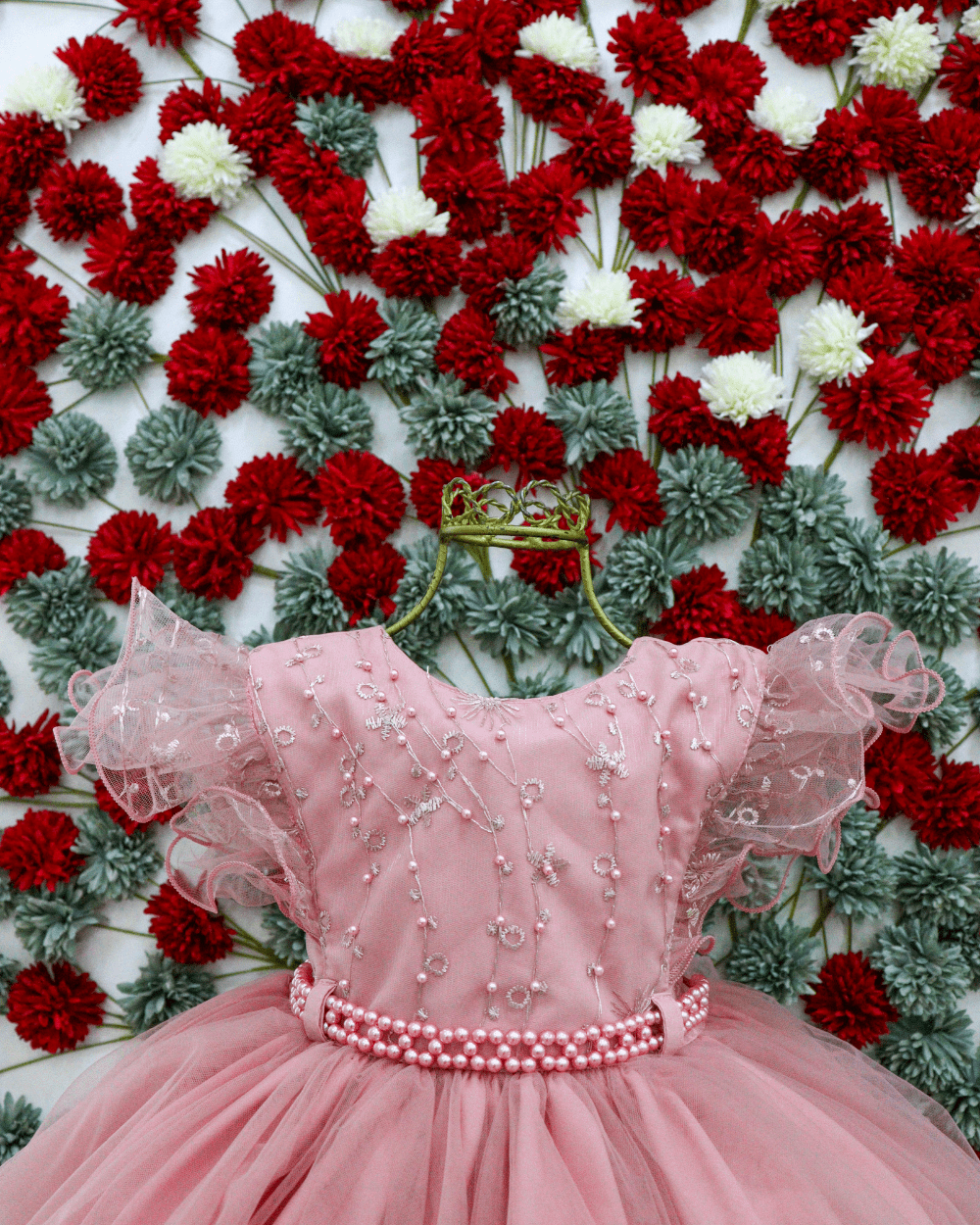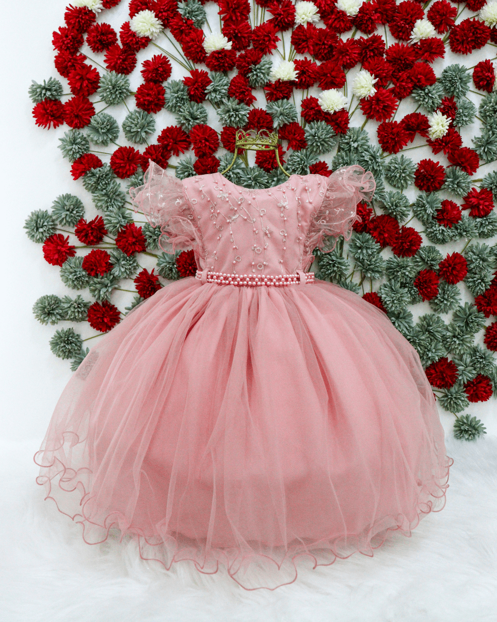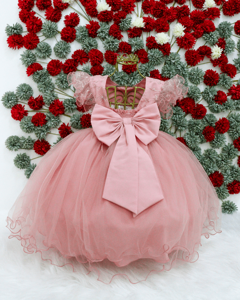 Vestido, manga curta, com detalhes no peito super delicado saia em tule e costa elástica para melhor ajuste ao corpo.