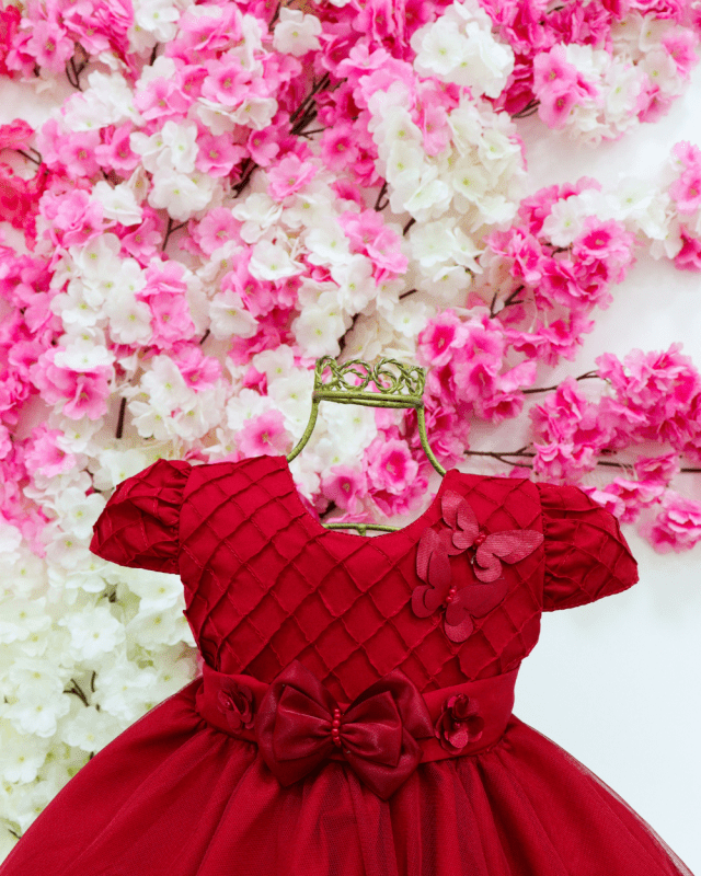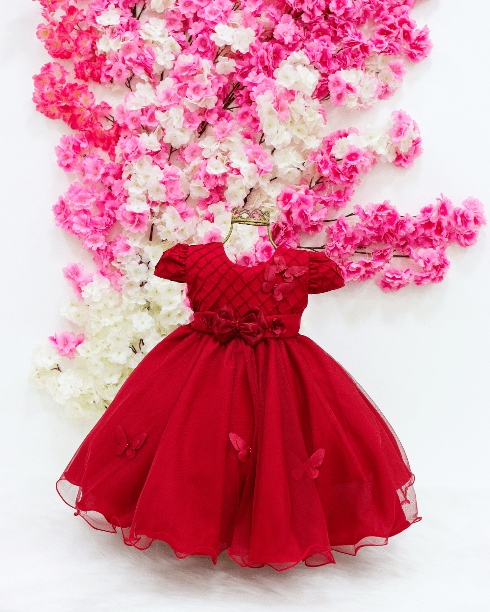 Vestido infantil manga curta , peito quadriculado com aplicação de pérolas sintéticas e borboletas, cintura com cintinho. Saia com aplicação de borboletas. Elástico nas costas ajustável ao corpo e faixa para melhor ajuste.