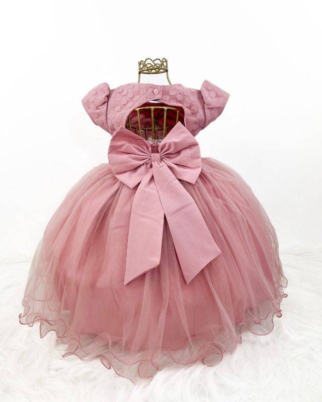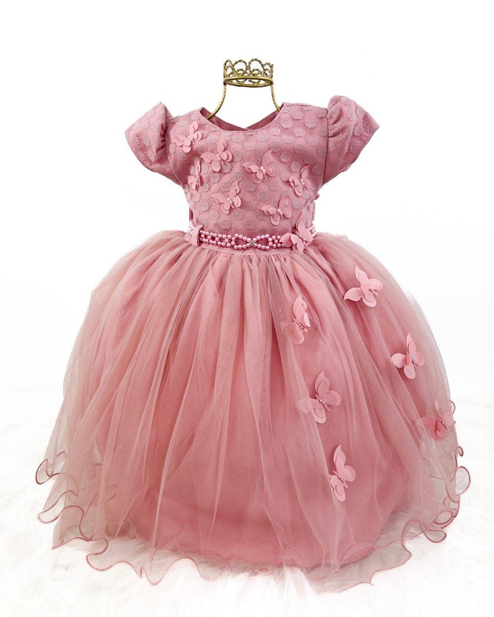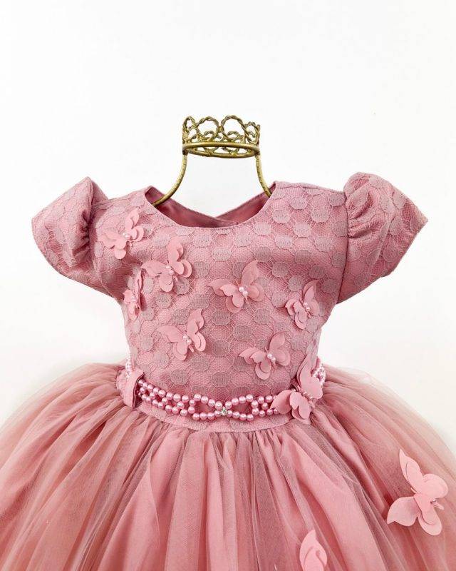 Vestido infantil manga curta, peito quadriculado com aplicação de borboletas, saia com aplicações de borboletas voal tule. Cintura com passante para cintinho de strass. Elástico nas costas ajustável ao corpo e laço broche..
