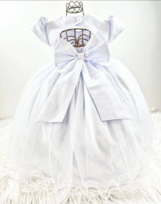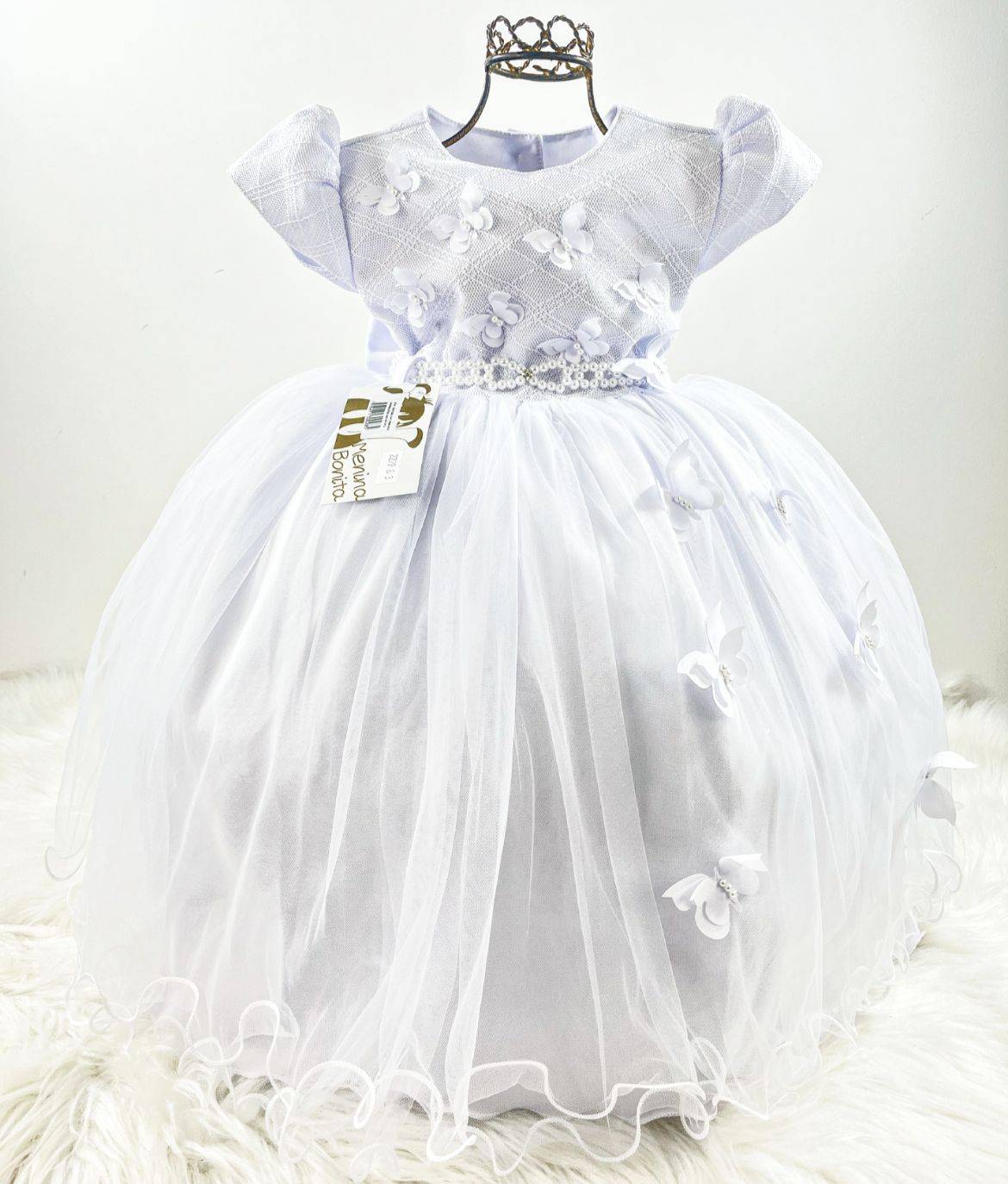 Vestido infantil manga curta, peito com aplicação de borboletas, saia com aplicações de borboletas voal tule. Cintura com passante para cintinho de pérolas sintéticas. Elástico nas costas ajustável ao corpo e laço broche.