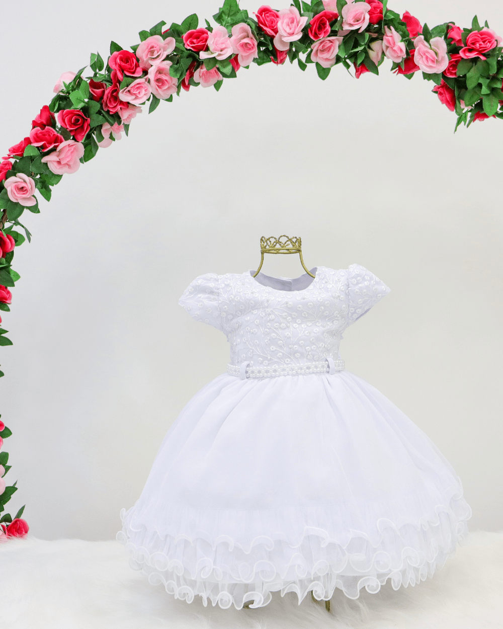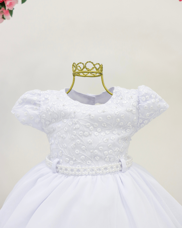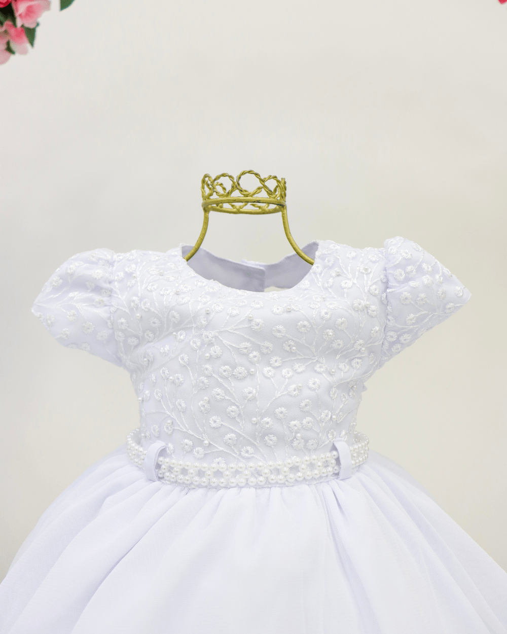 Vestido Menina Bonita, vestido manga curta com cinto de pérolas, peito com aplicações, costas semi aberta e laço removível.