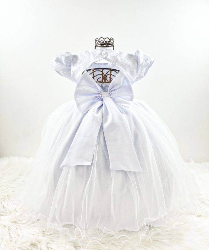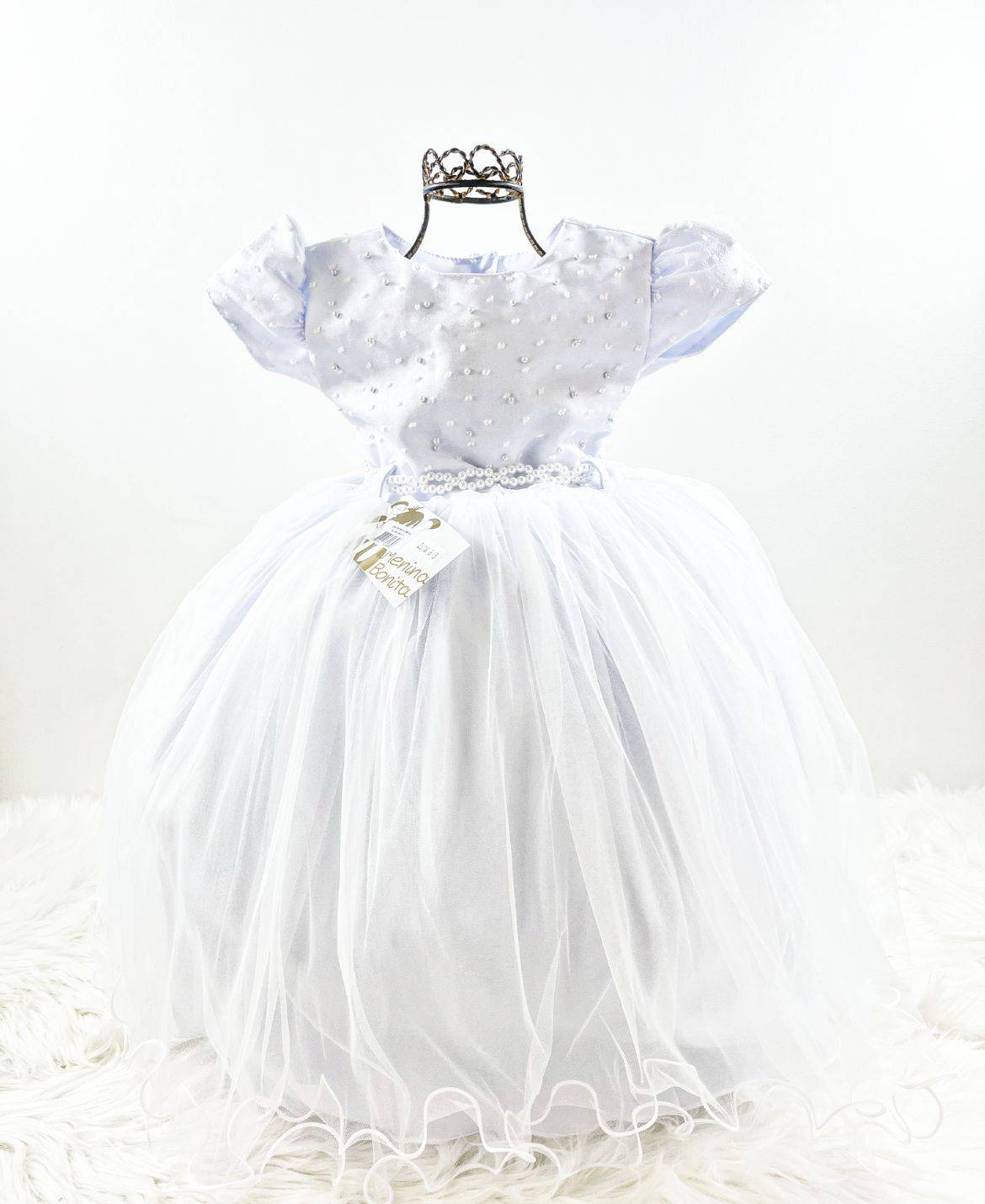 Vestido infantil manga curta, peito com detalhes e pérolas sintéticas. Cintura bordada com pérolas sintéticas, saia lisa com uma camada de tule, elástico nas costas ajustável ao corpo.