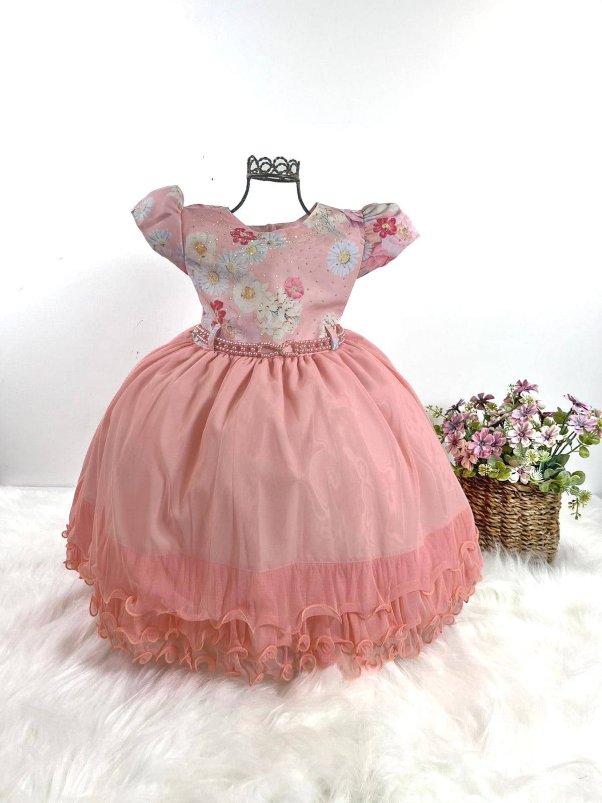 Vestido infantil manga curta, com estampa de flores, saia lisa com camadas. Cintura com passante para cintinho de strass. Elástico nas costas ajustável ao corpo e laço broche.