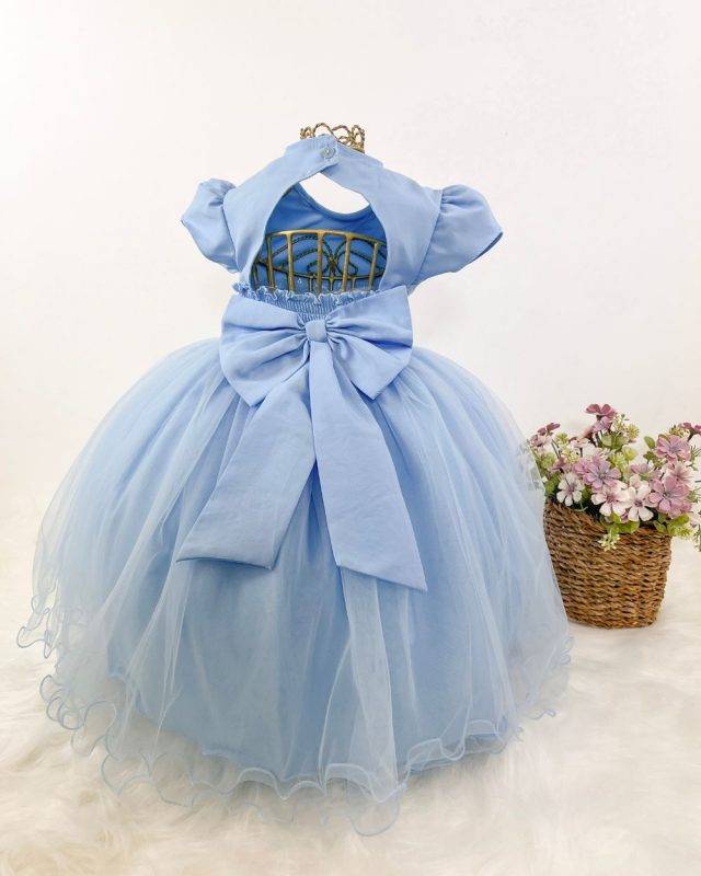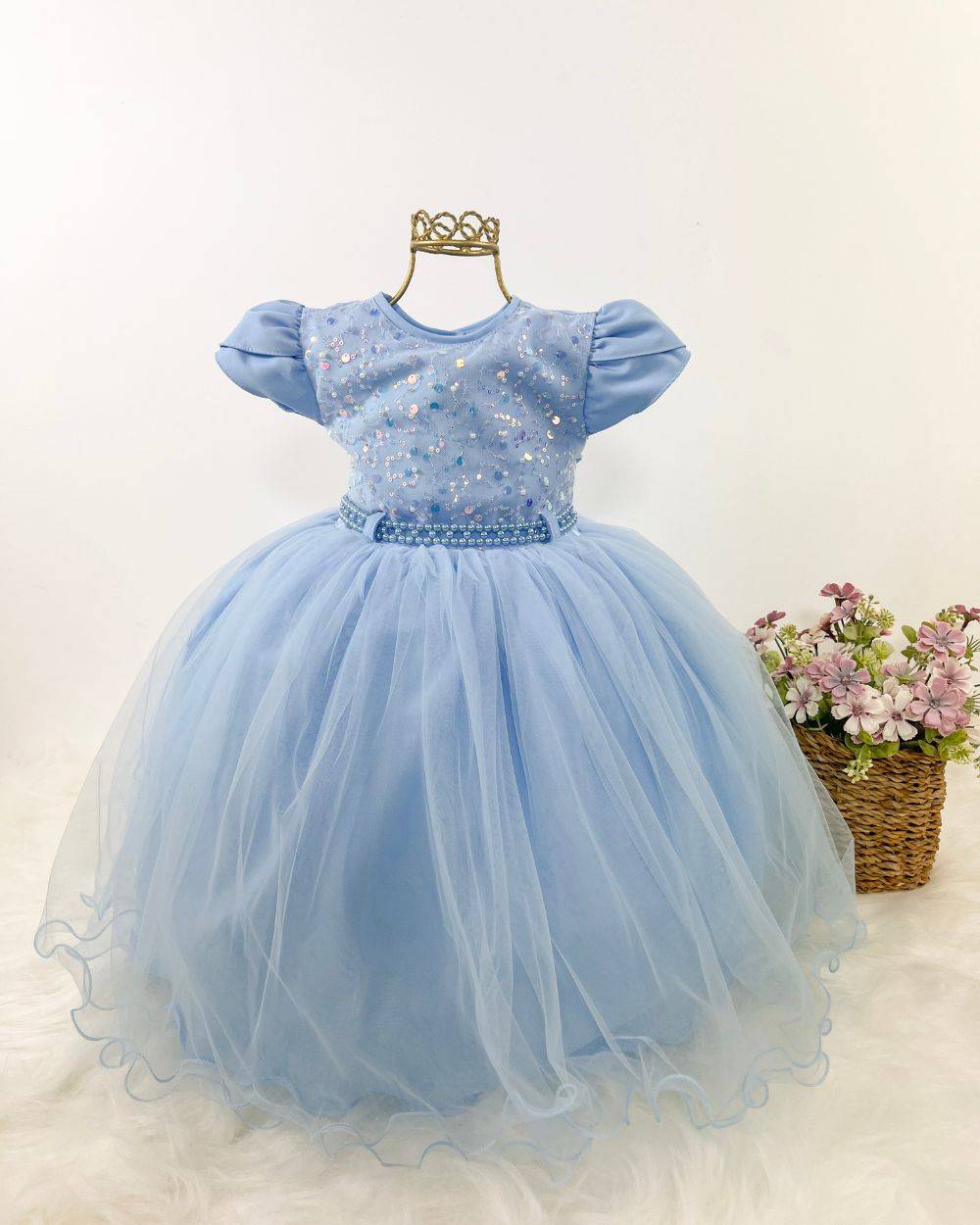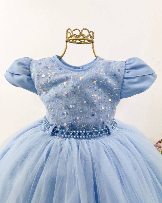 Vestido, menina bonita, manga curta, na cor azul, o peito dele é bordado e a saia lisa em tule, super delicado , em sua cintura tem passante acompanhado de um lindo cinto trabalhado em pérola, costas semi fechada e laço removível.