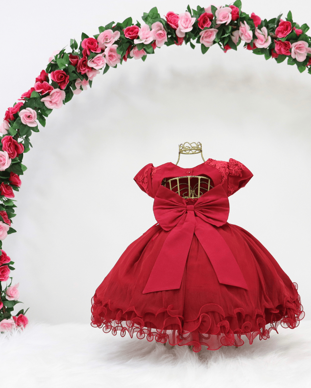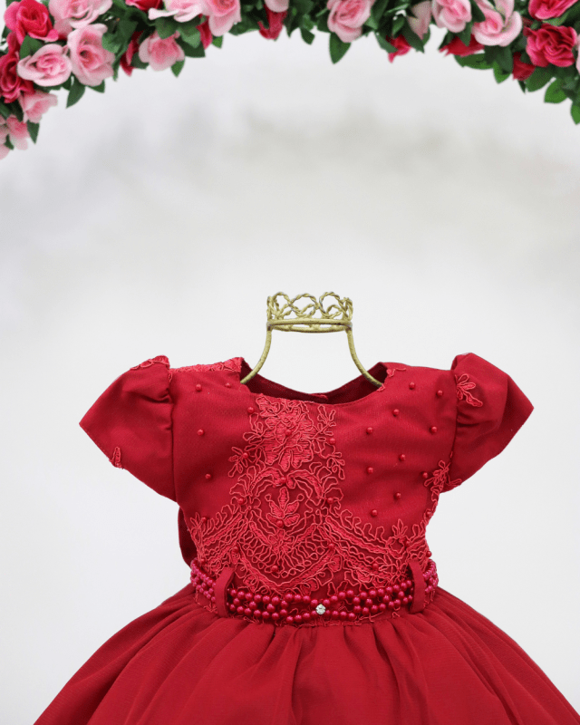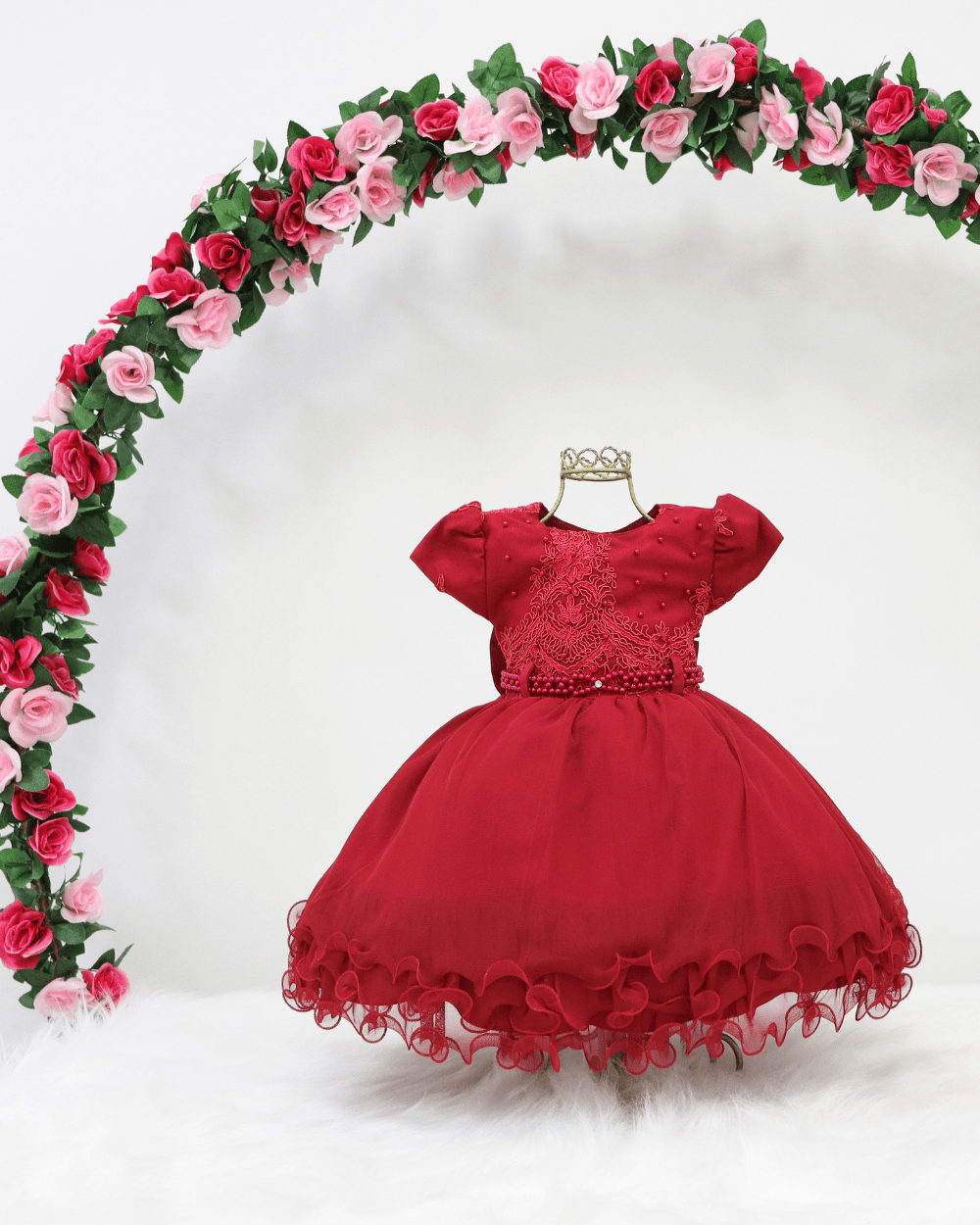 Vestido Menina Bonita, vestido manga curta com cinto de pérolas, peito com aplicações, costas semi aberta e laço removível. Composição: Vestido: 100% Poliéster. Saia/Babados/Tules: 100% Poliamida. Saiote/Forro da saia: 100% Algodão.