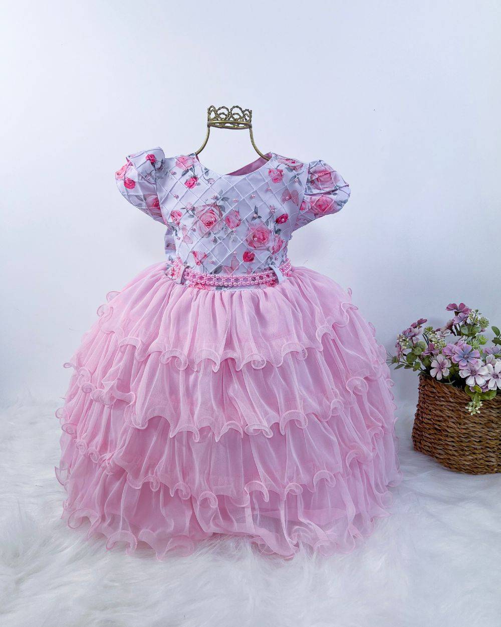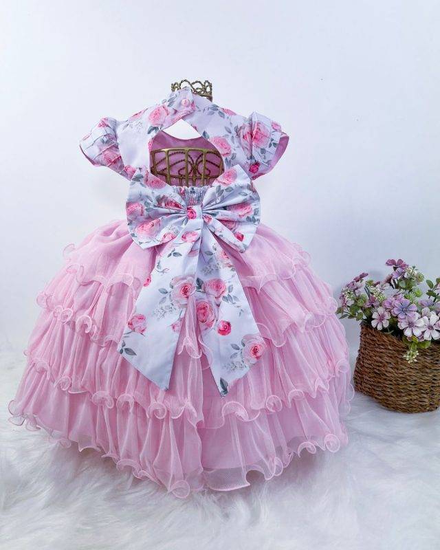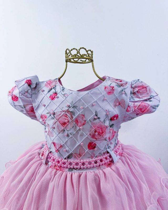 Vestido, menina bonita, manga curta, peito estampado e saia de babados, em sua cintura tem passante acompanhado de um lindo cinto trabalhado em pérola. costas semi fechada e laço removível.