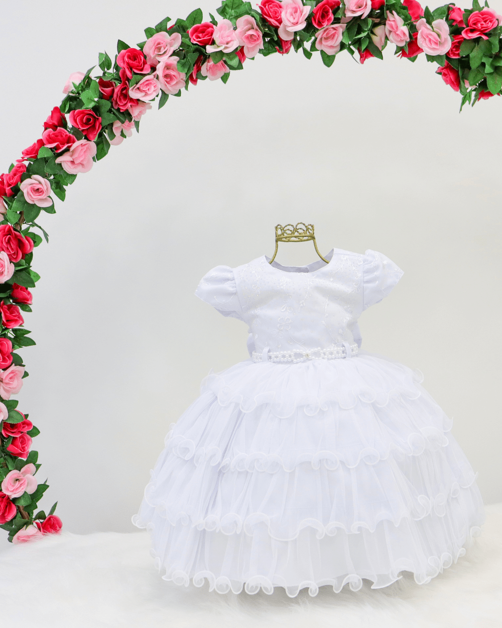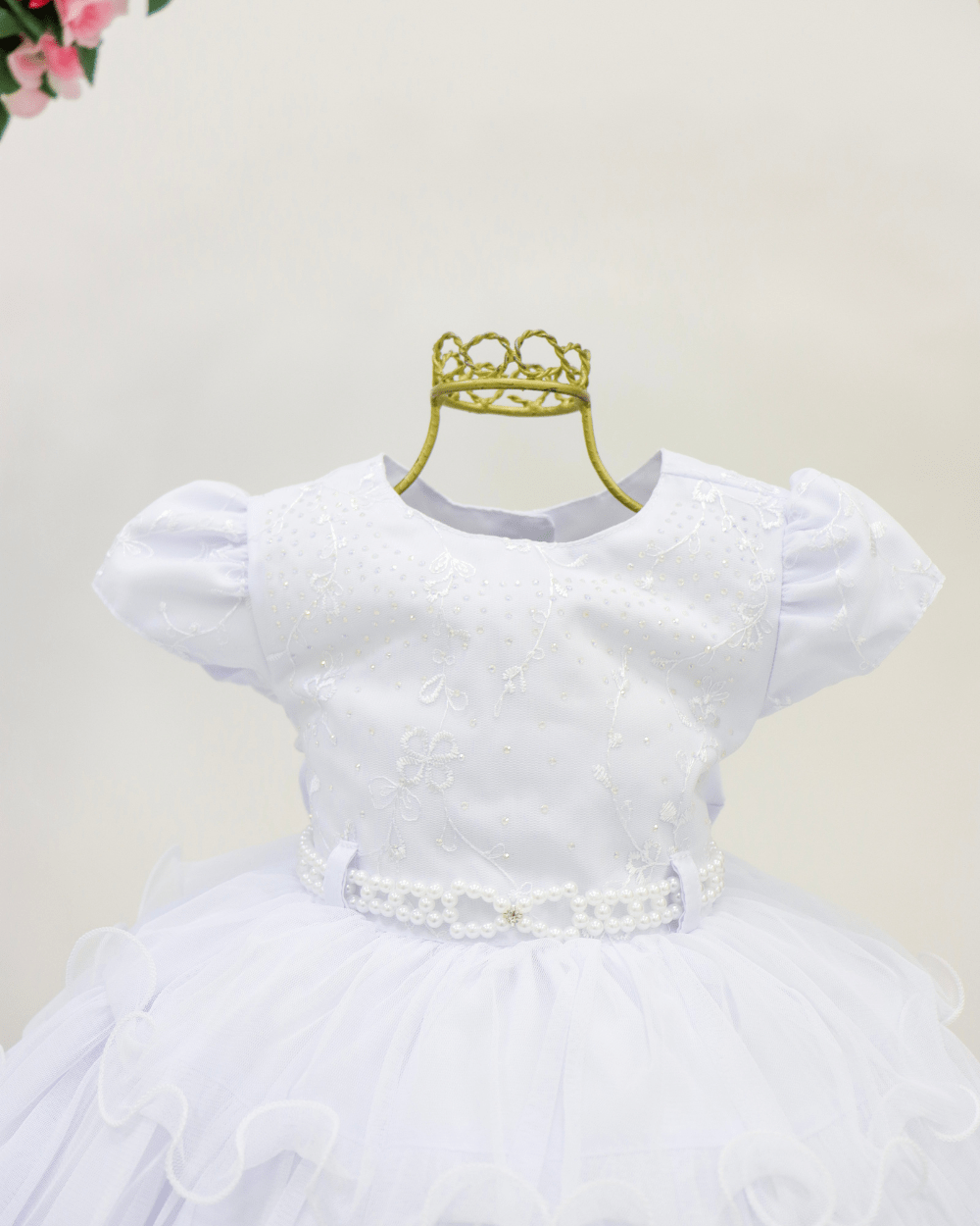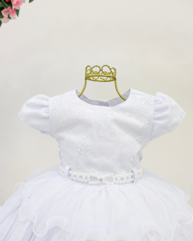 Vestido Menina Bonita, vestido manga curta com cinto de pérolas, peito com aplicações, costas semi aberta e laço removível.