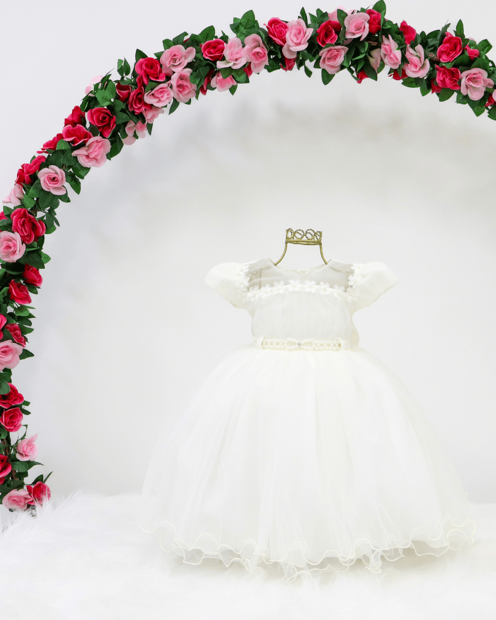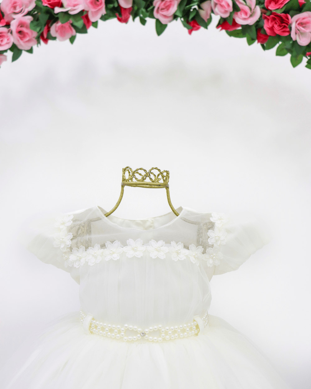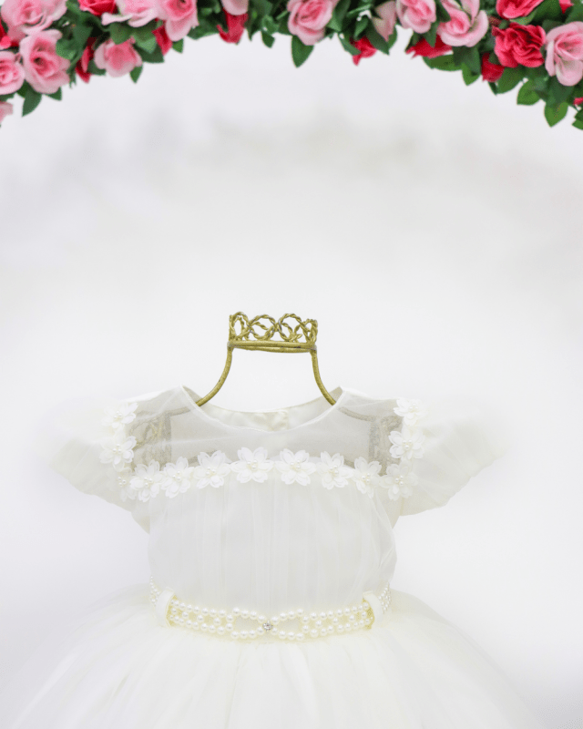 Vestido Menina Bonita, vestido manga curta com cinto de pérolas, peito com aplicações, costas semi aberta e laço removível.