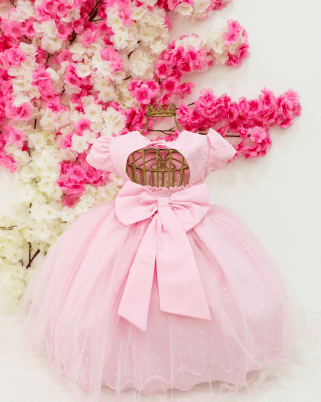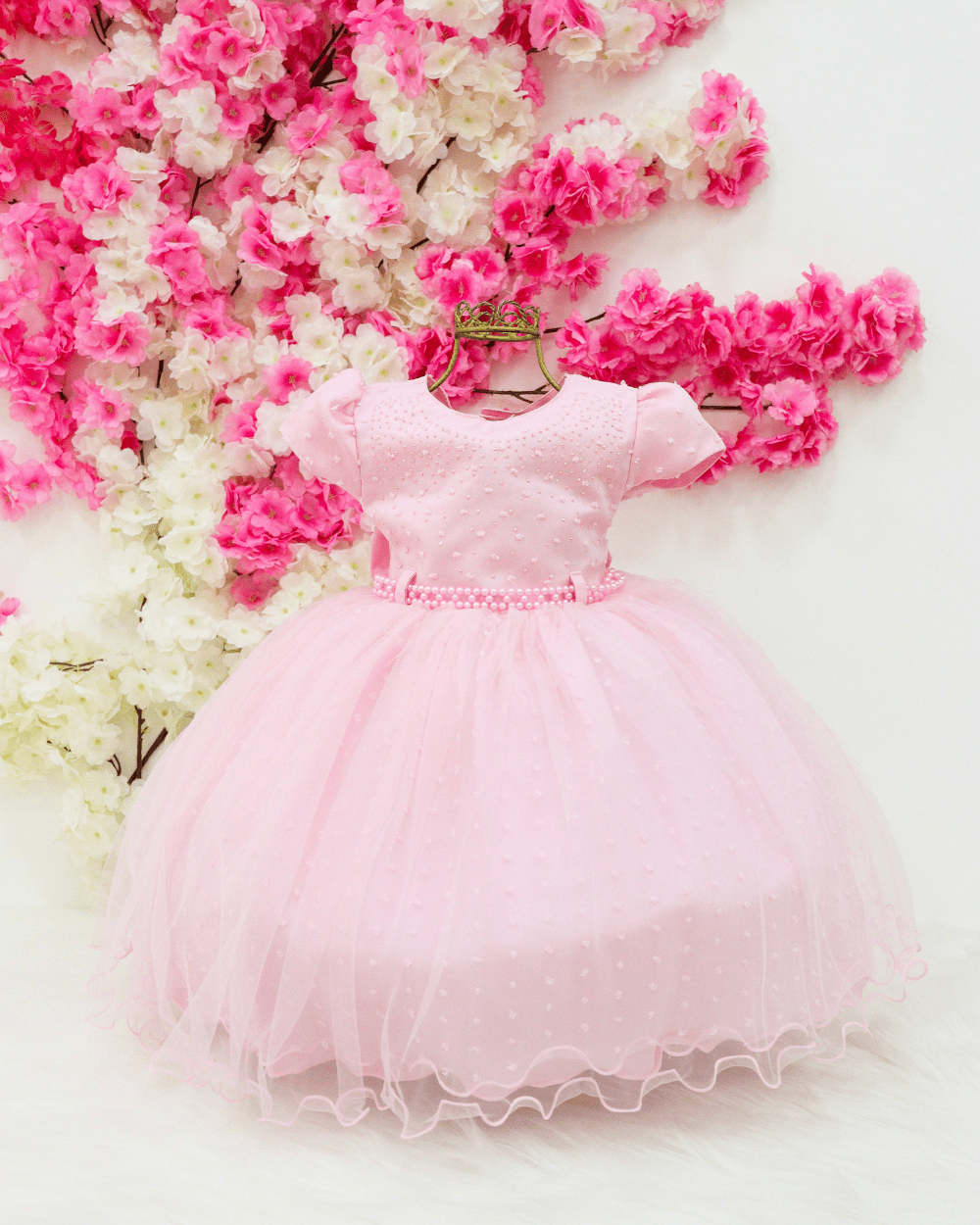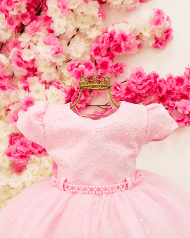 Vestido Menina Bonita, vestido manga curta com cinto de pérolas, peito rendado com aplicações em strass, costas semi aberta e laço removível.