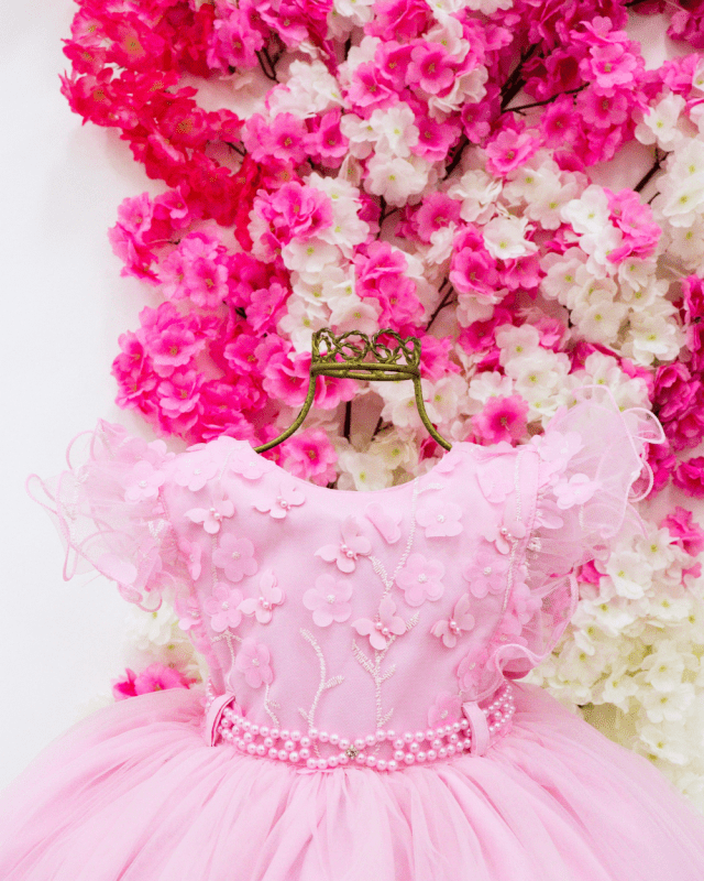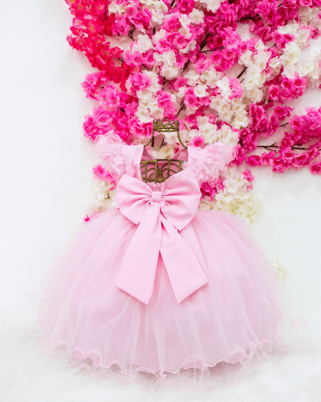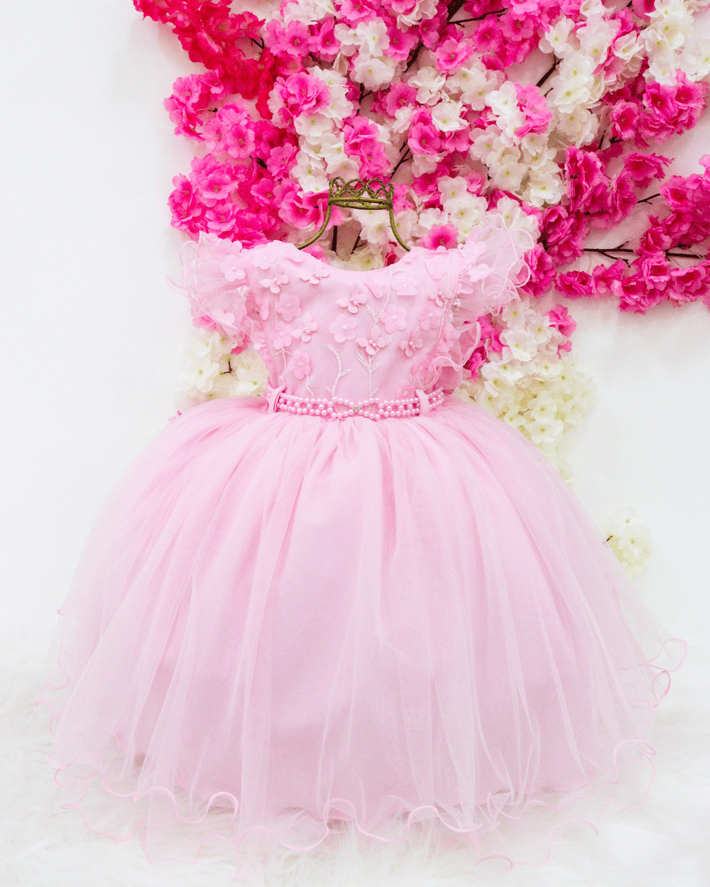 Vestido, manga curta, com peito rendado super delicado saia em tule, cinto de pérolas e costa elástica para melhor ajuste ao corpo.