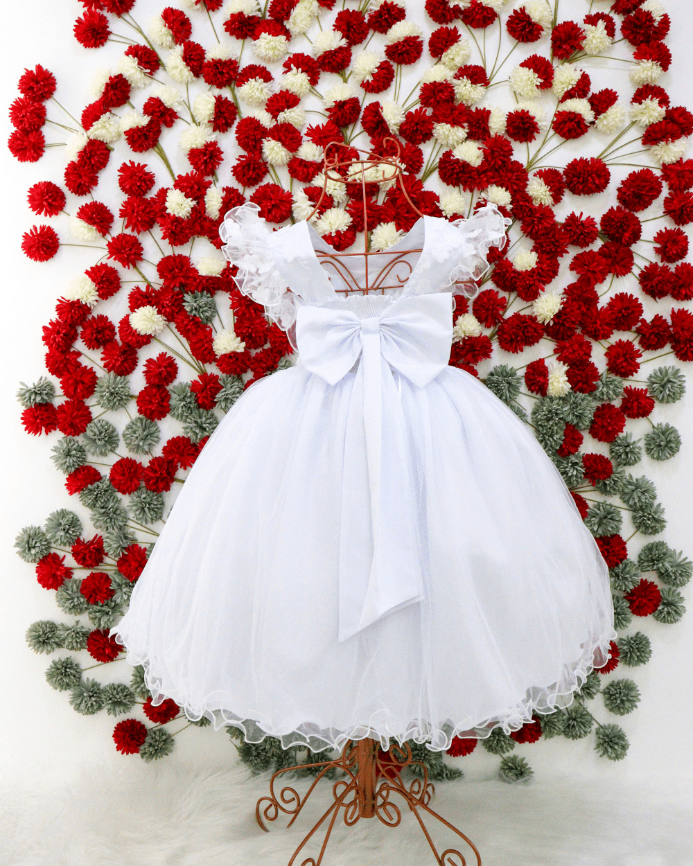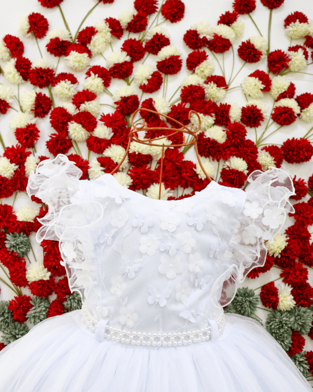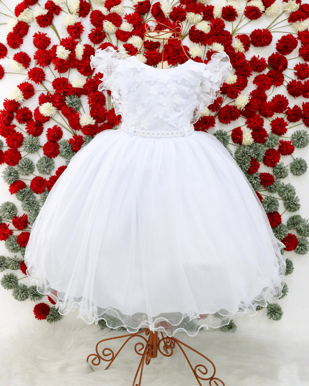 Vestido, manga curta, com peito rendado super delicado saia em tule, cinto de pérolas e costa elástica para melhor ajuste ao corpo.