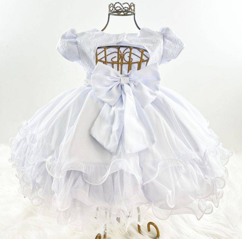 Vestido infantil manga curta, peito rendado com strass, saia lisa voal tule. Cintura com passante para cintinho de pérolas sintéticas . Elástico nas costas ajustável ao corpo e laço broche.