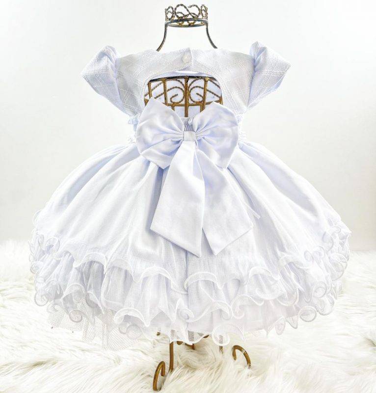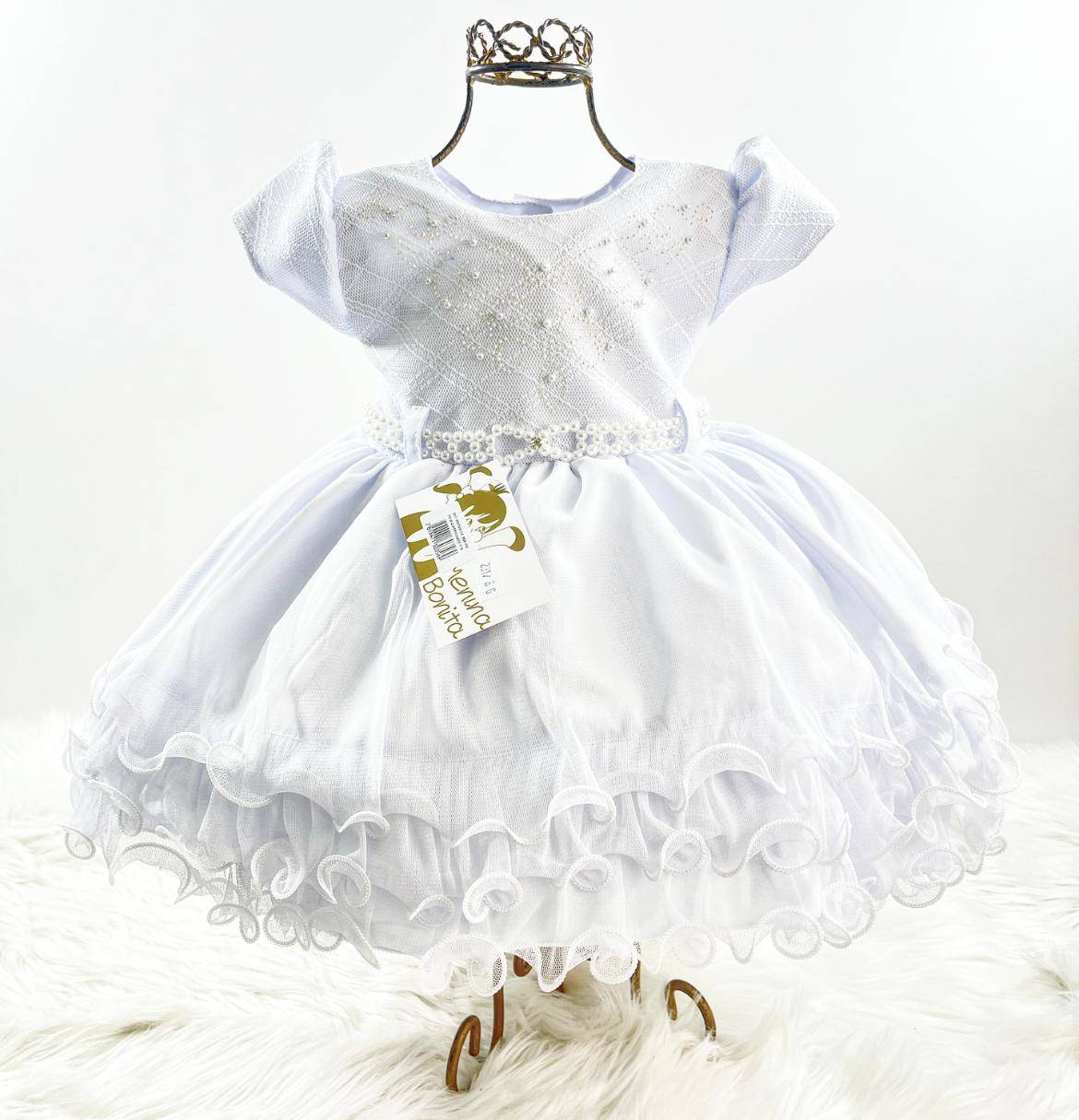 Vestido infantil manga curta, peito com renda, strass e pérolas sintéticas. Cintura bordada com pérolas sintéticas, saia lisa com uma camada de tule, elástico nas costas ajustável ao corpo.