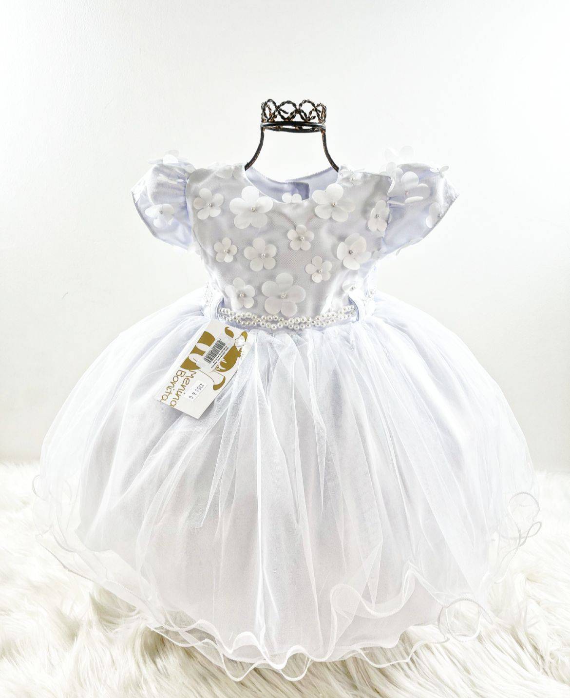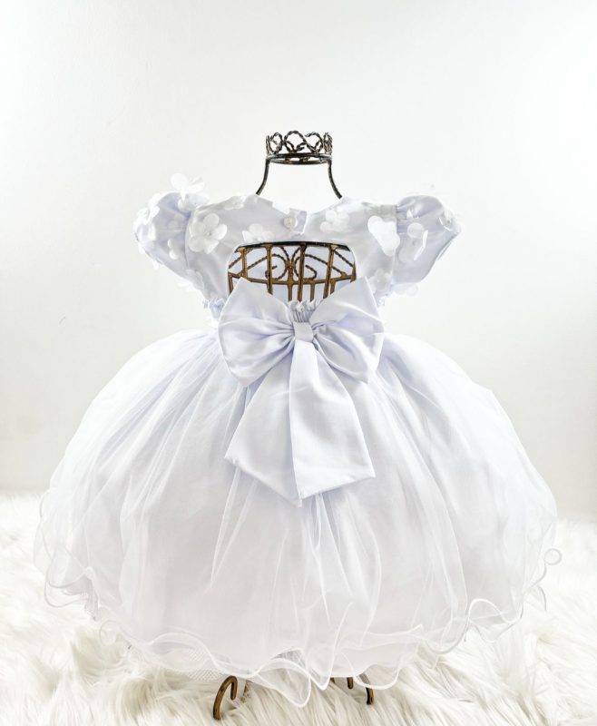Vestido infantil manga curta, peito com aplique de borboletas, manga com detalhes, saia lisa voal tule. Cintura com passante para cintinho de strass. Elástico nas costas ajustável ao corpo e laço broche.