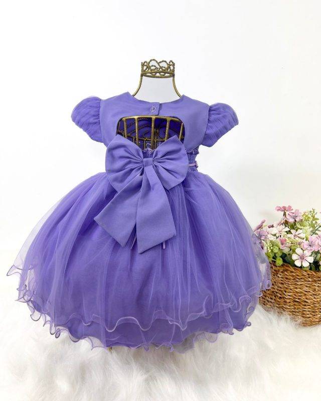 Vestido, menina bonita, manga curta, em sua cintura tem passante acompanhado de um lindo cinto trabalhado em perola, costas semi fechada e laço removível.