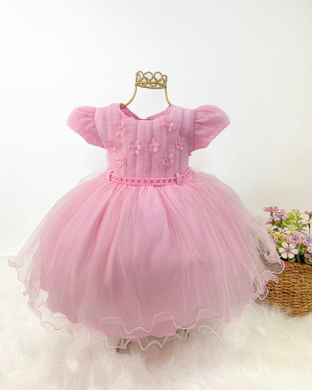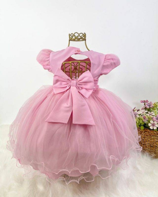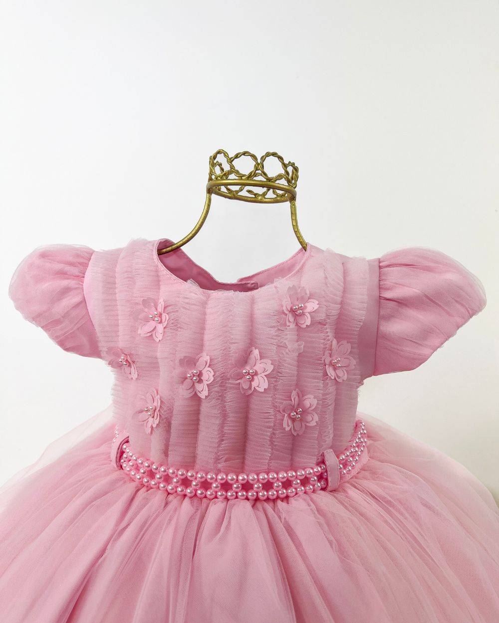Vestido, menina bonita, manga curta, em sua cintura tem passante acompanhado de um lindo cinto trabalhado em perola, costas semi fechada e laço removível.