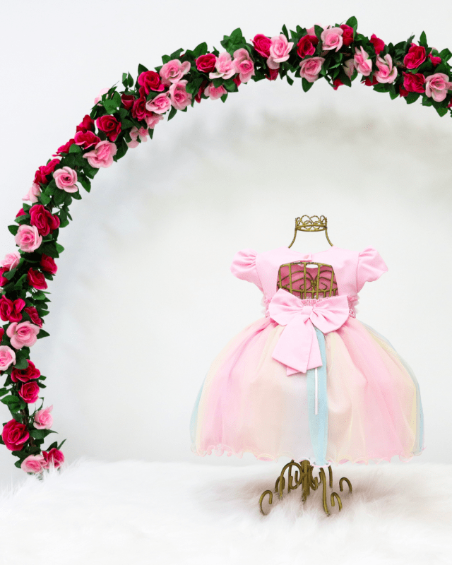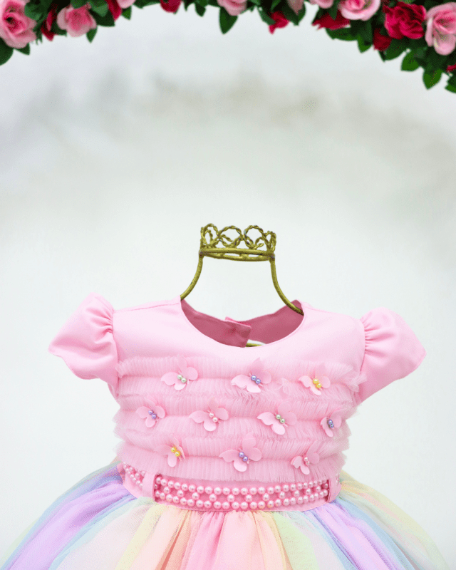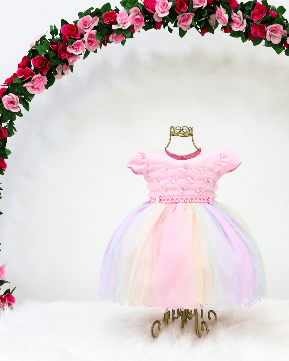 Vestido Menina Bonita, vestido manga curta com cinto de pérolas, peito com aplicações, costas semi aberta e laço removível e saia de tule colorida.