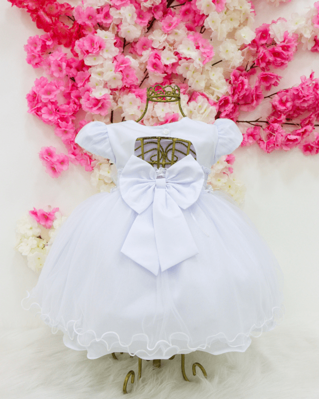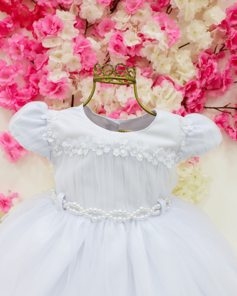 Vestido Menina Bonita, vestido manga curta com cinto de pérolas, peito com aplicações, costas semi aberta e laço removível.