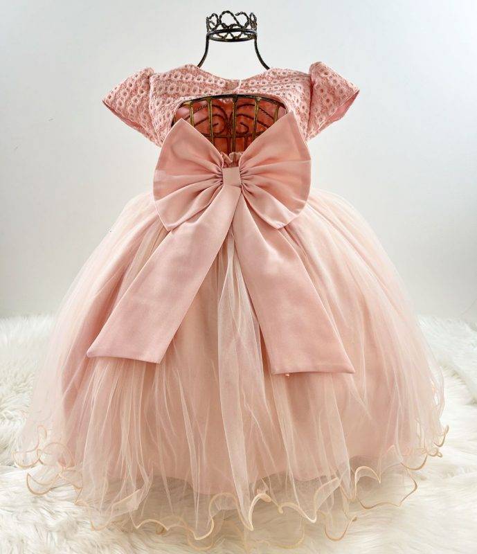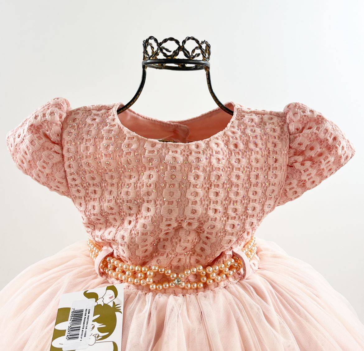 Vestido infantil manga curta, peito rendado com strass, saia lisa voal tule. Cintura com passante para cintinho de pérolas sintéticas . Elástico nas costas ajustável ao corpo e laço broche.