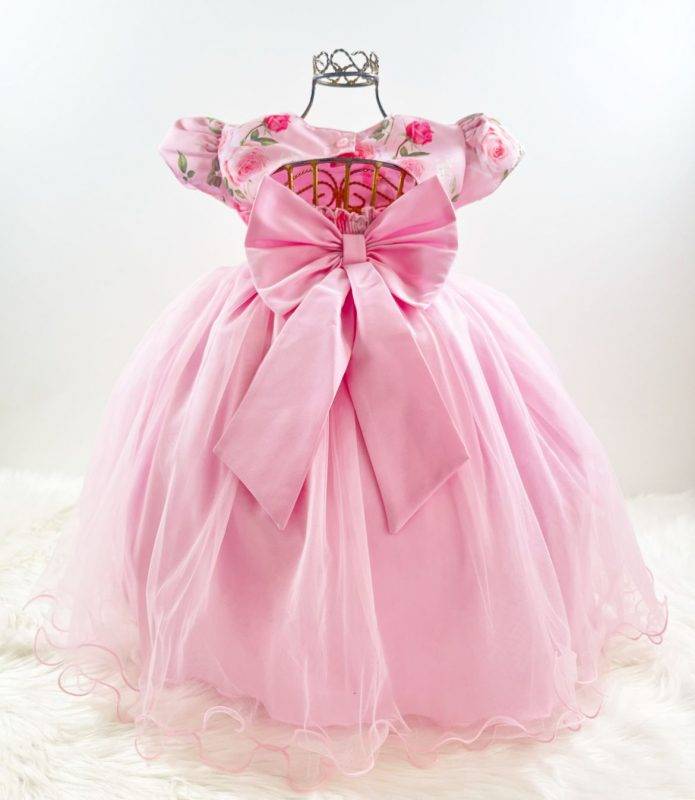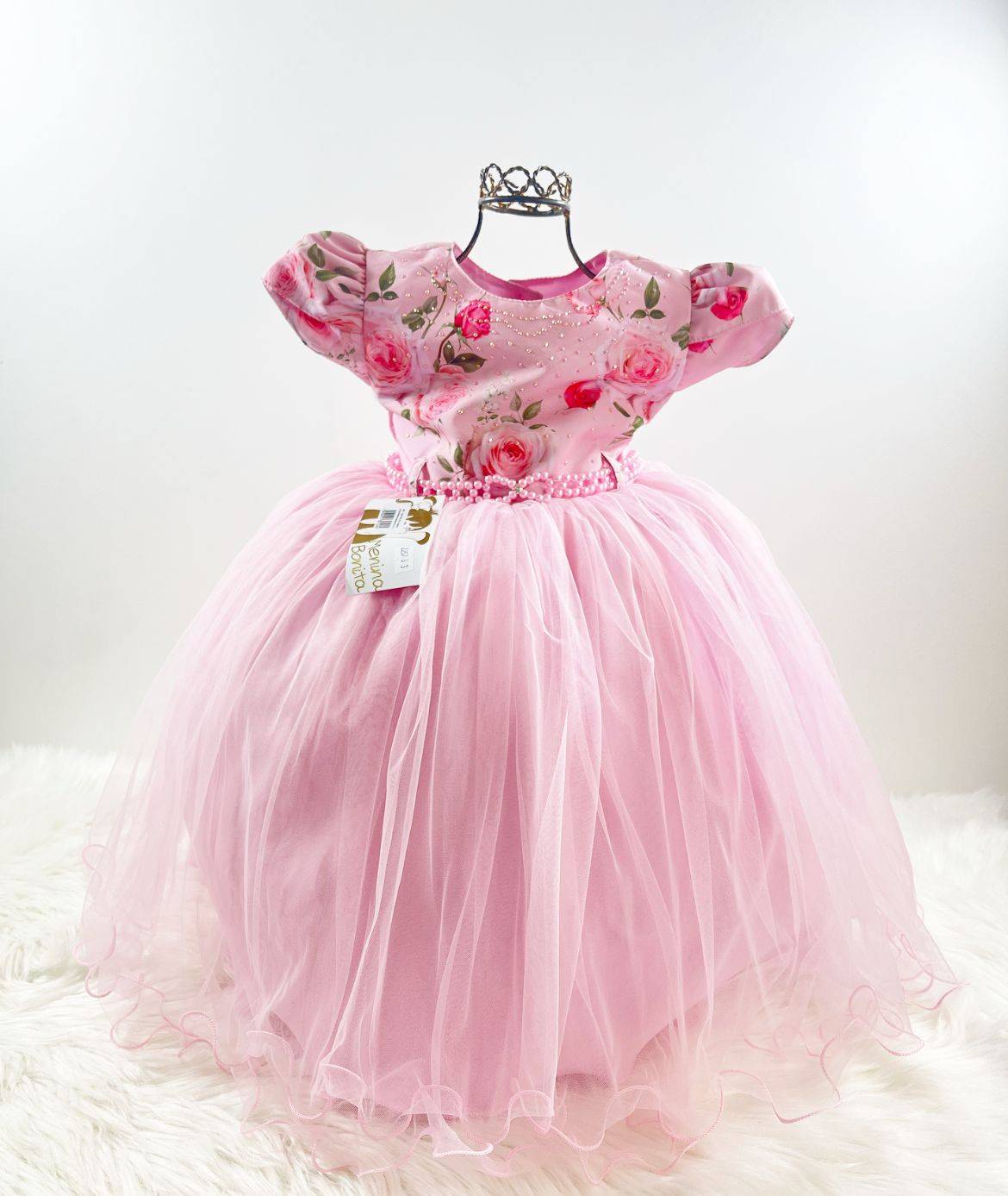 Vestido infantil manga curta, peito estampado com strass, saia lisa voal tule. Cintura com passante para cintinho de pérolas sintéticas . Elástico nas costas ajustável ao corpo e laço broche.