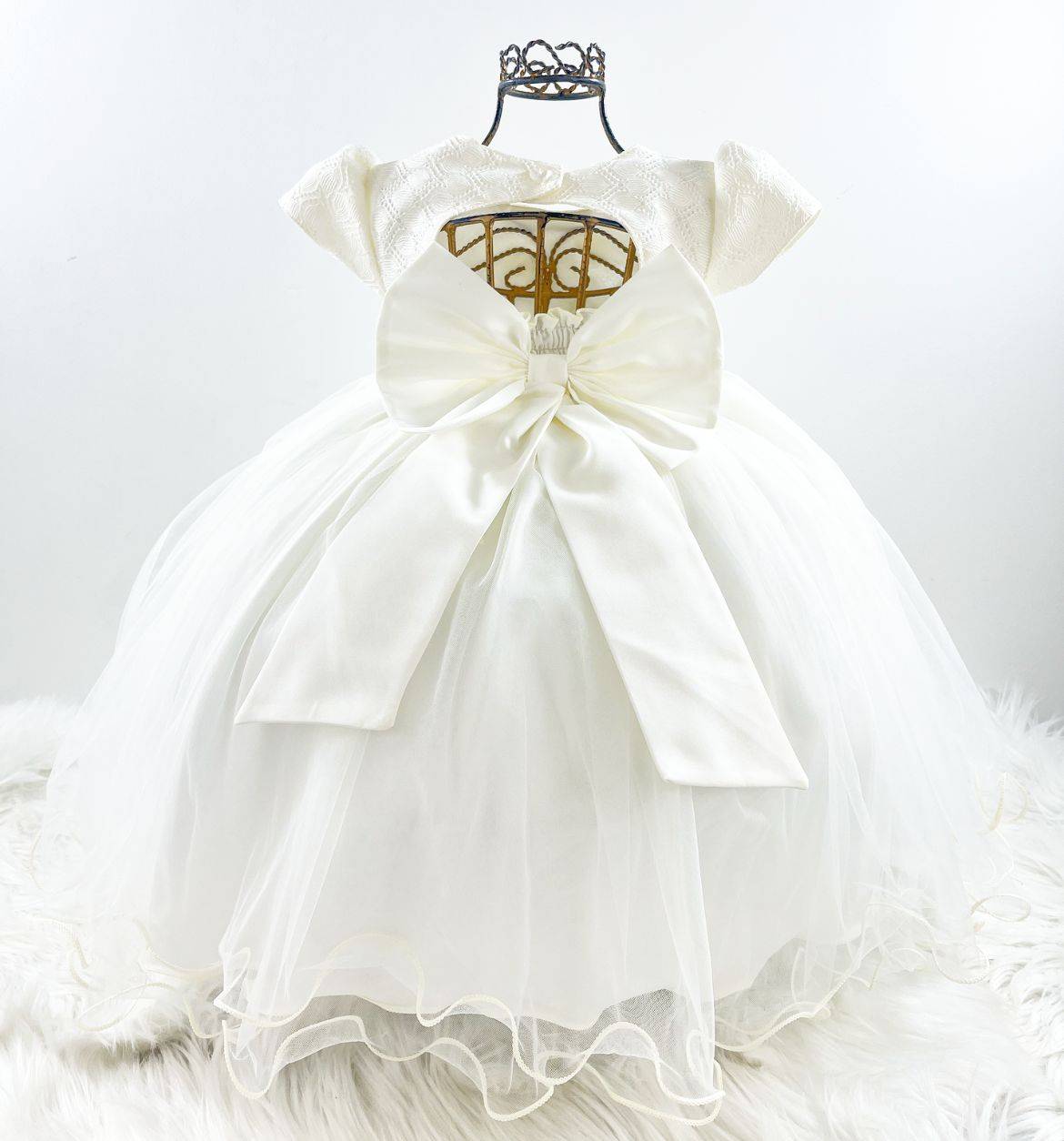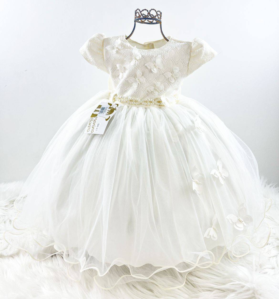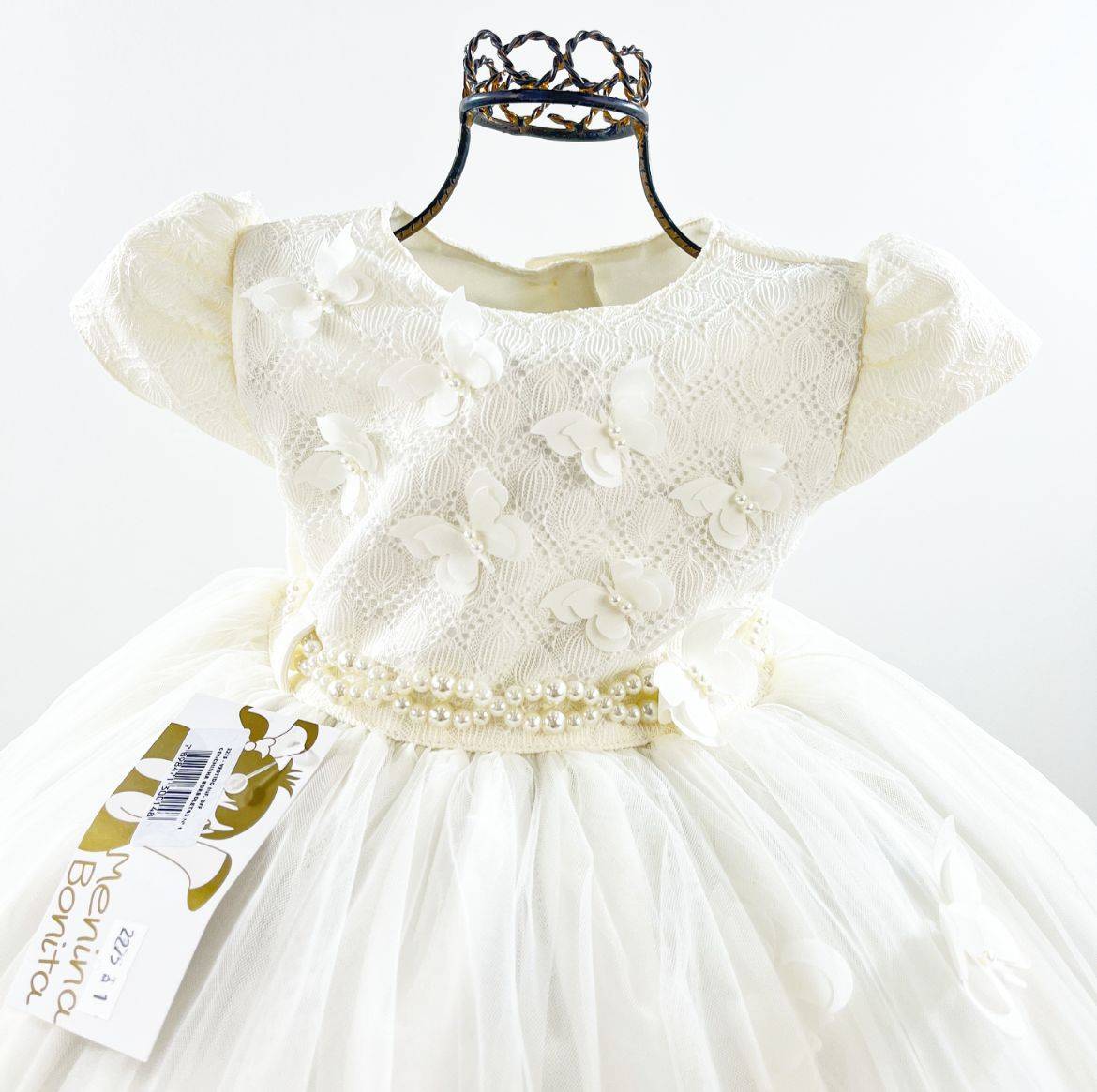 Vestido infantil manga curta, peito com aplicação de borboletas, saia com aplicações de borboletas voal tule. Cintura com passante para cintinho de strass. Elástico nas costas ajustável ao corpo e laço broche.