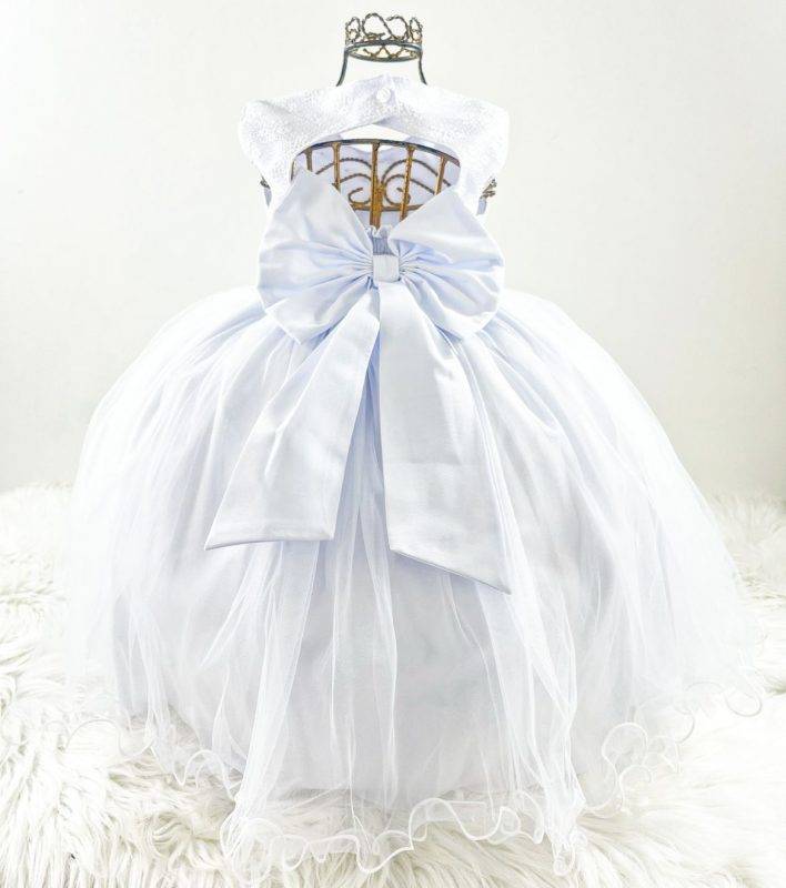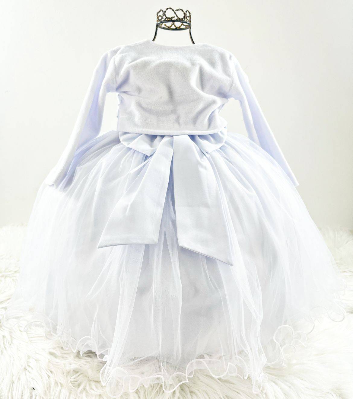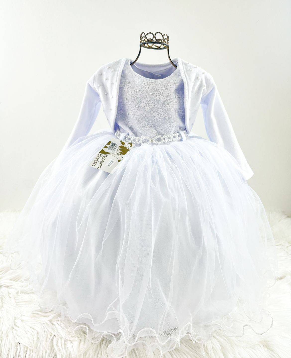 Vestido infantil regata com bolero, peito renda com pérolas sintéticas. Cintura com passante para cintinho de pérolas sintéticas, saia lisa com camada de tule,elástico nas costas ajustável ao corpo e laço broche.