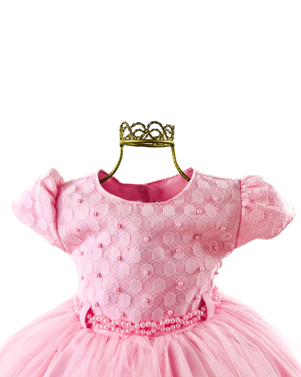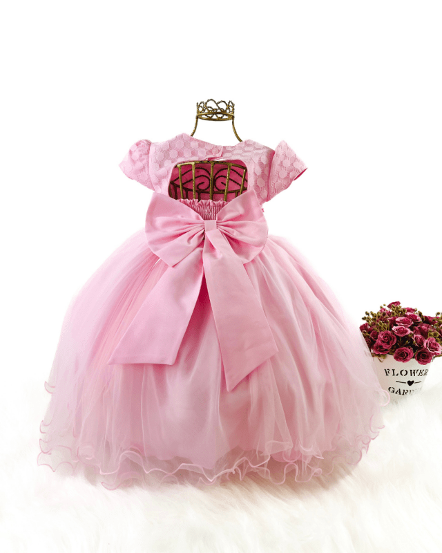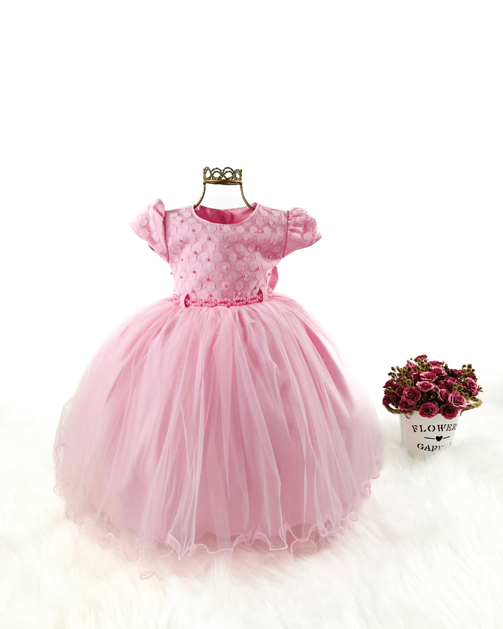 Vestido, menina bonita, manga curta, em sua cintura tem passante acompanhado de um lindo cinto trabalhado em pérola, costas semi fechada e laço removível.