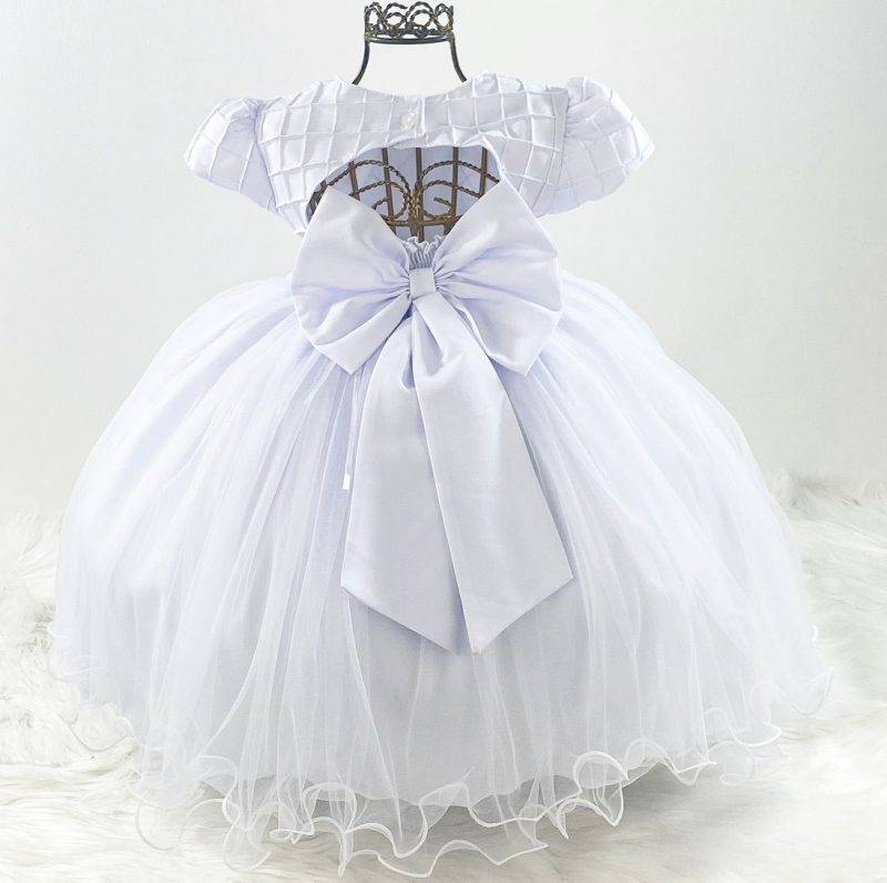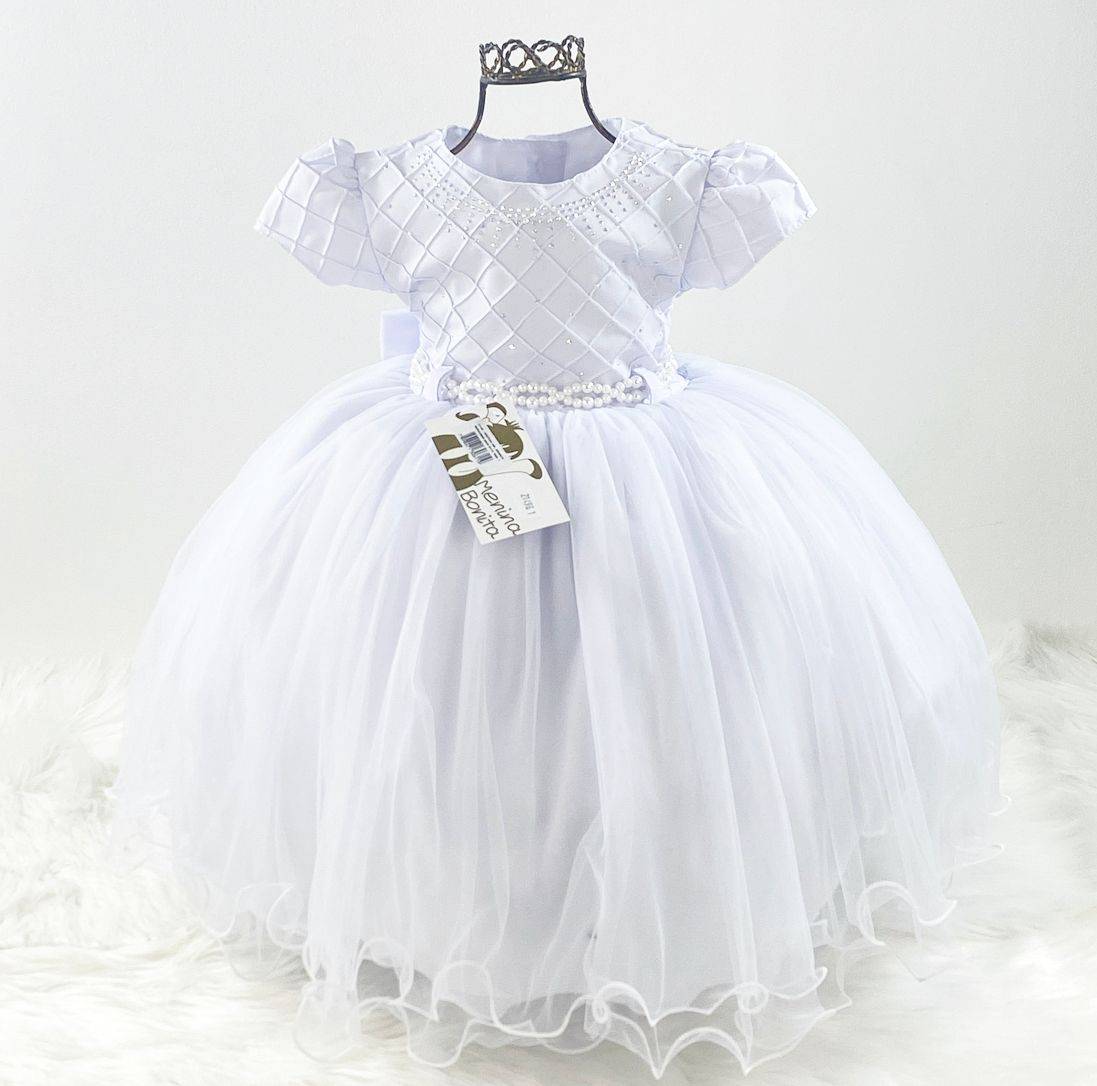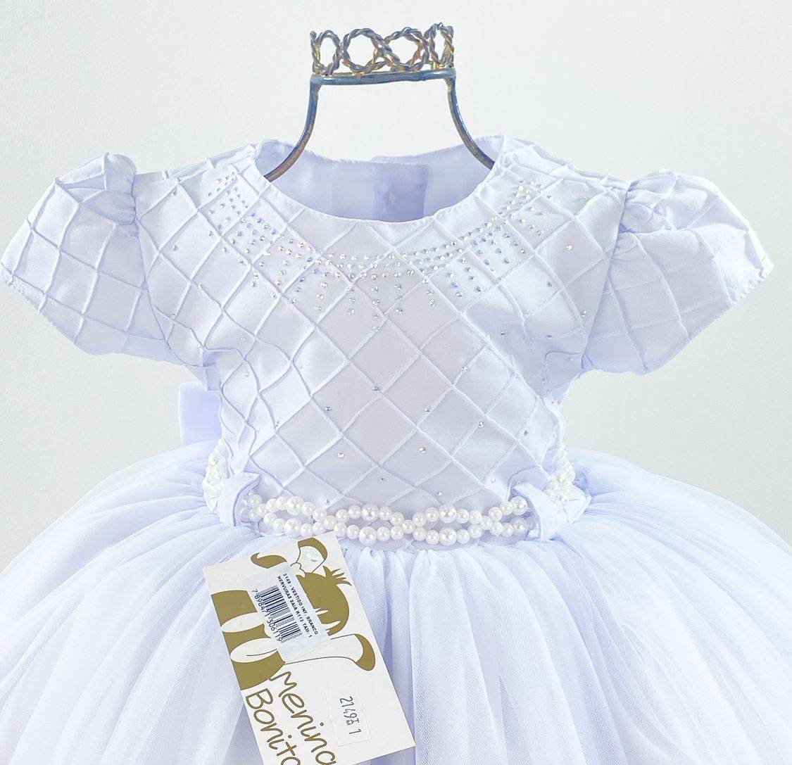 Vestido infantil manga curta, peito nervura e aplicação de strass. Cintura com passante para cintinho de pérolas sintéticas, saia lisa com camadas de tule, elástico nas costas ajustável ao corpo e laço broche. Cor: Branco