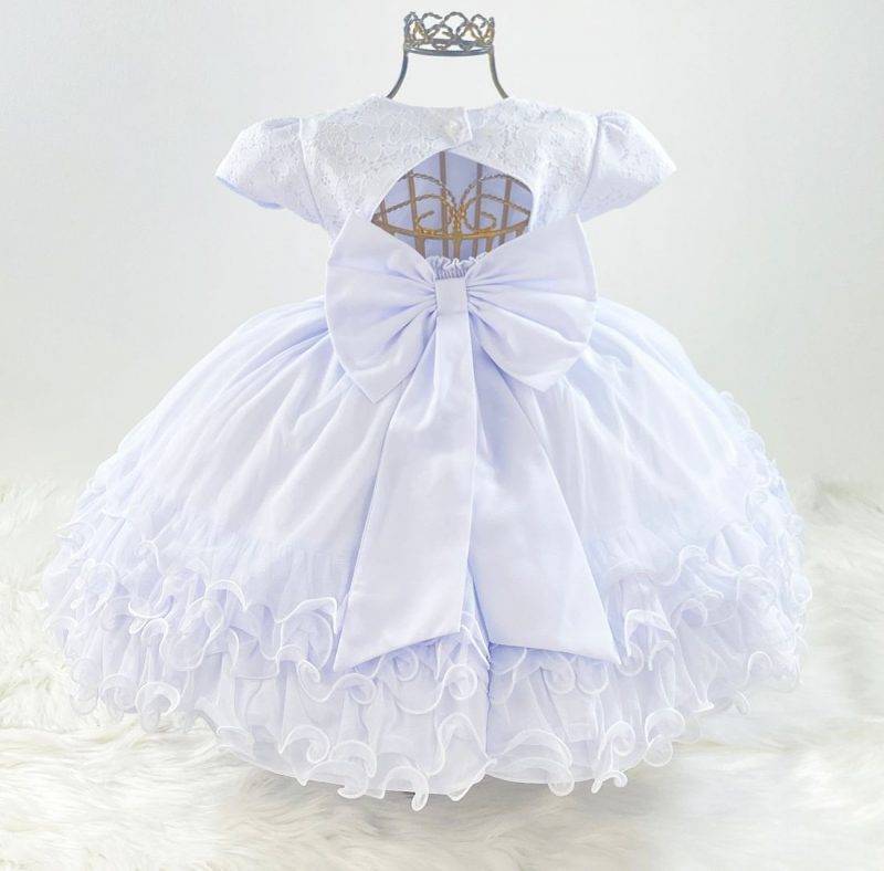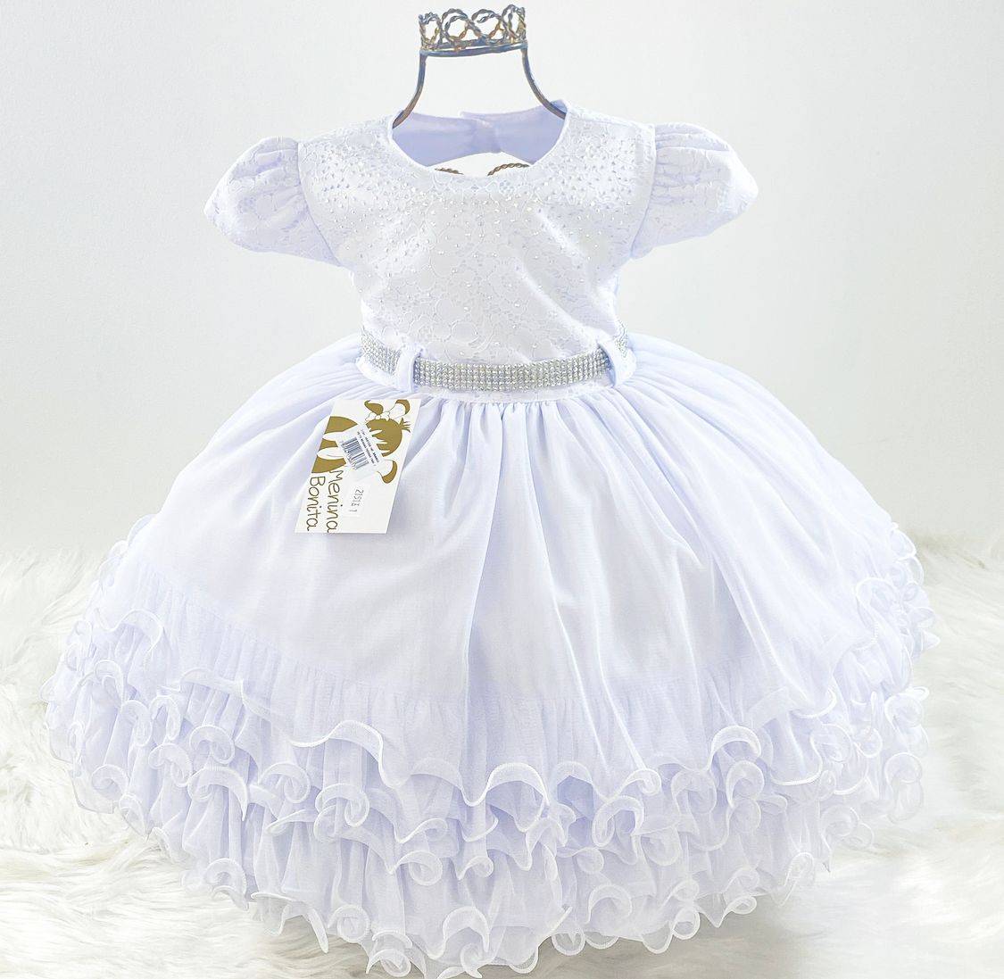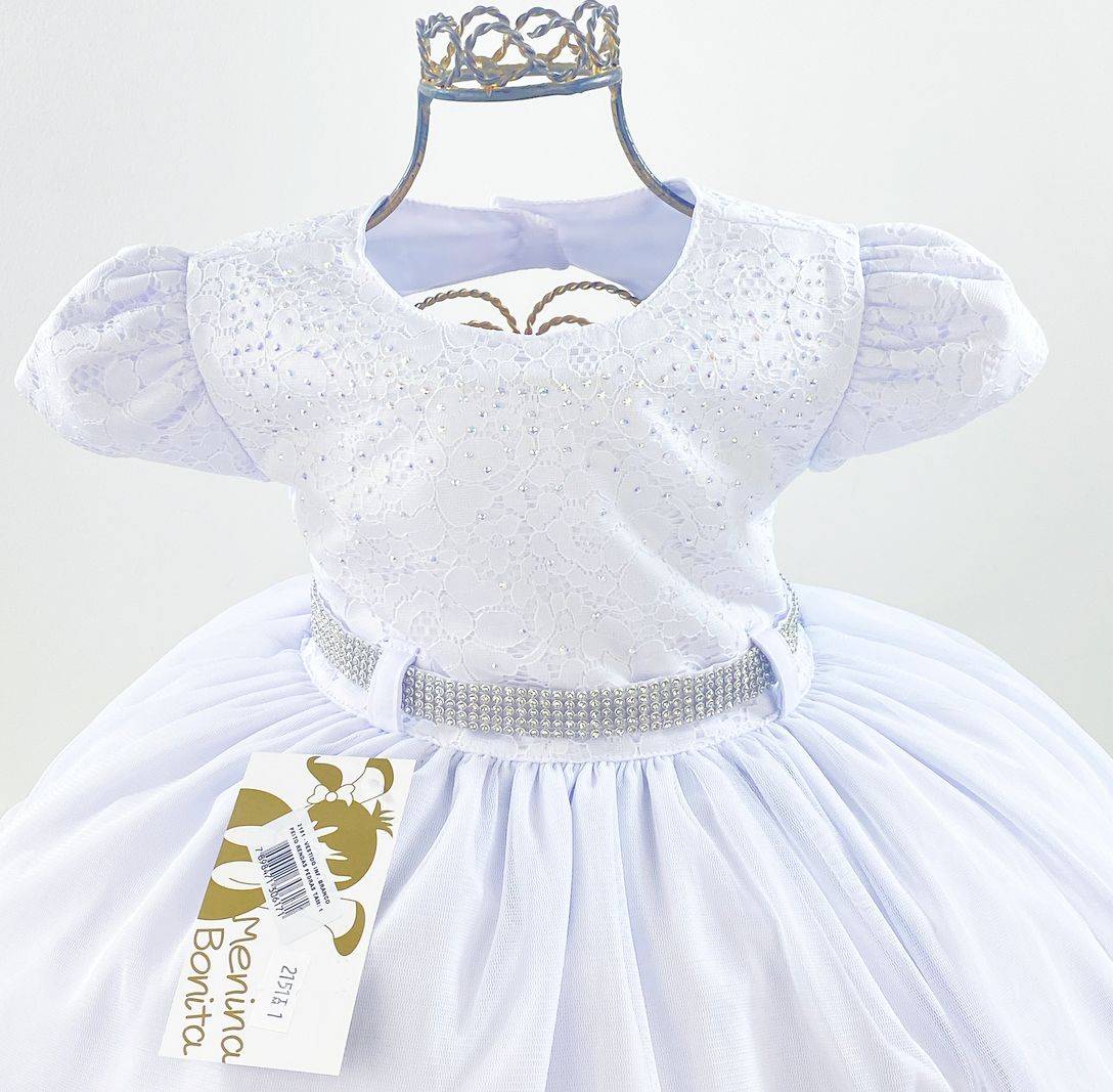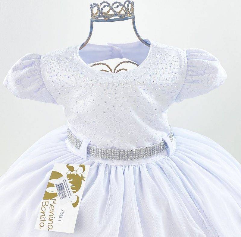 Vestido infantil manga curta, peito com renda e aplicações de strass. Cintura com passante para cintinho de strass, saia lisa com camadas de tule, elástico nas costas ajustável ao corpo e laço broche. Cor: Branco