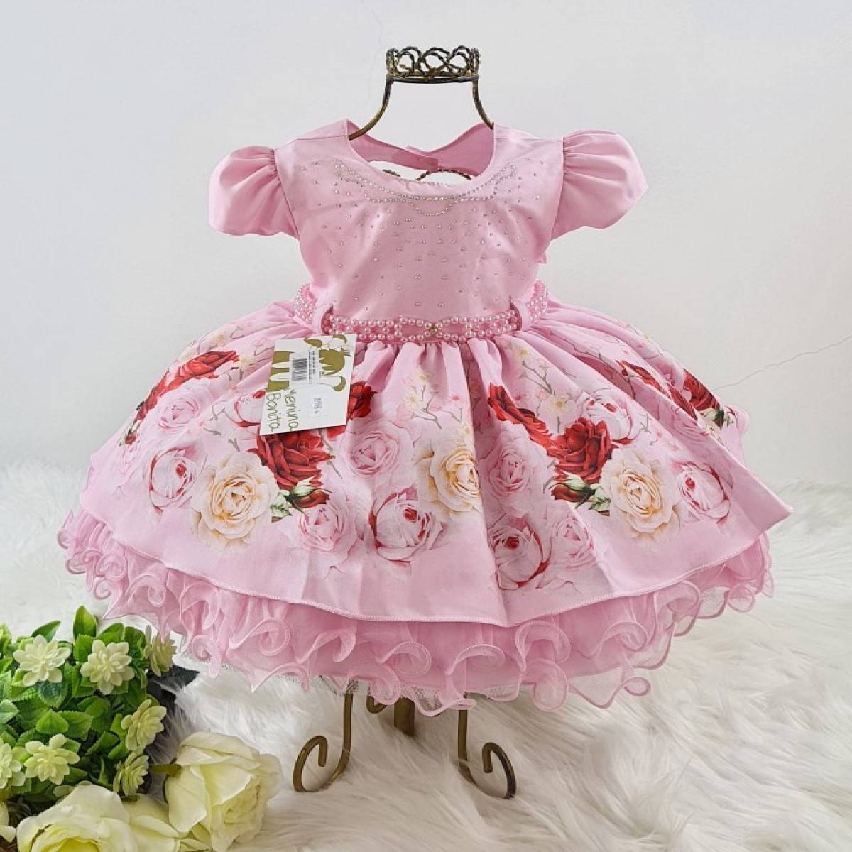 Vestido infantil manga curta, peito com aplicação de strass, saia estampa flores vermelhas, com acabamento babado tule. Cintura com passante para cintinho de pérolas sintéticas. Elástico nas costas ajustável ao corpo e laço broche.