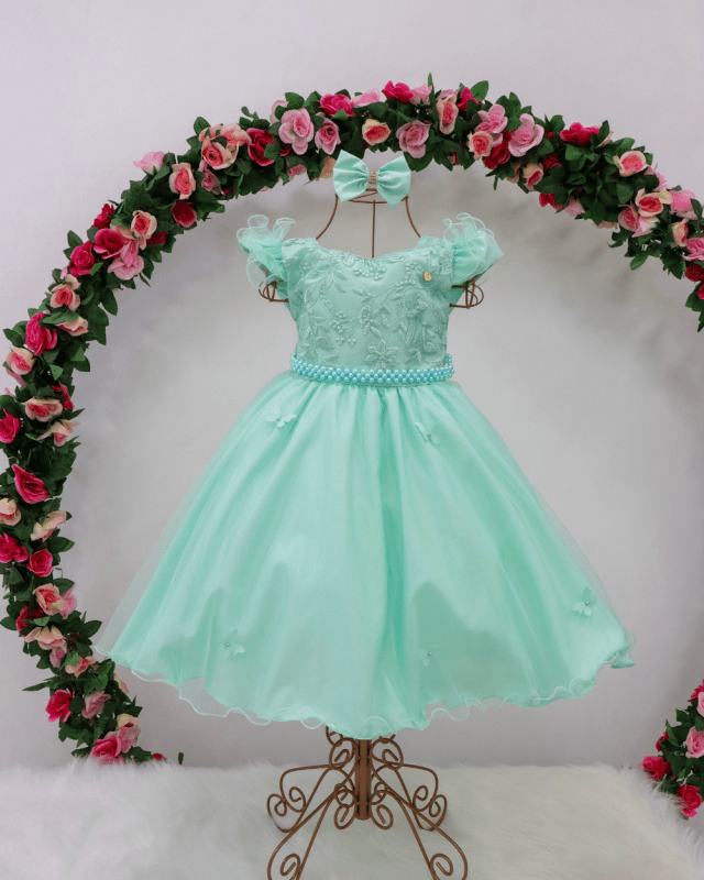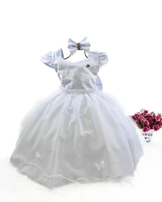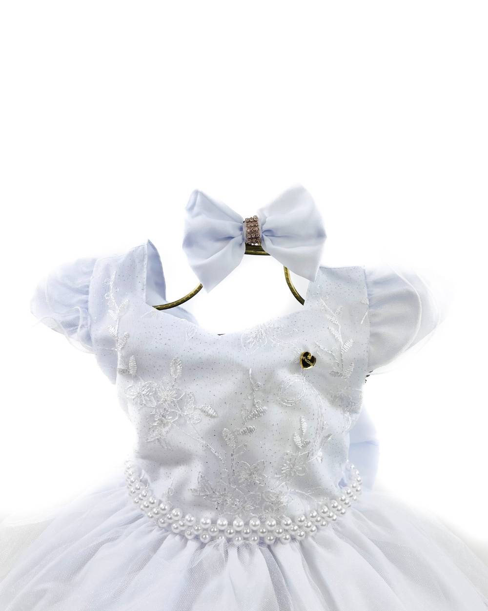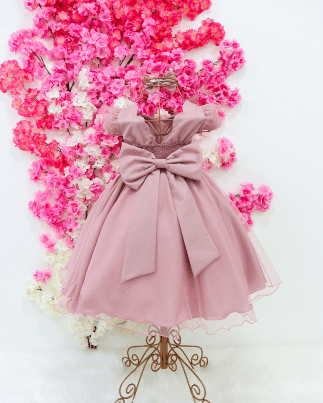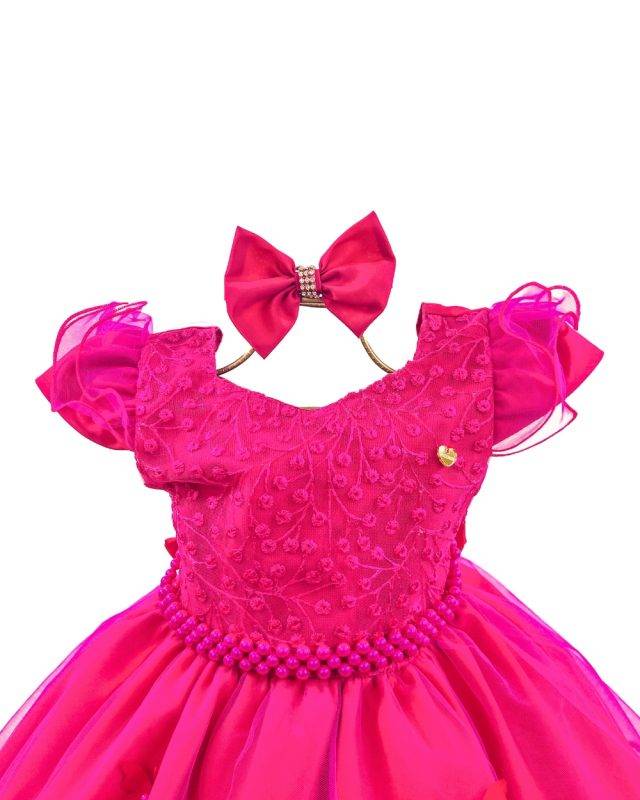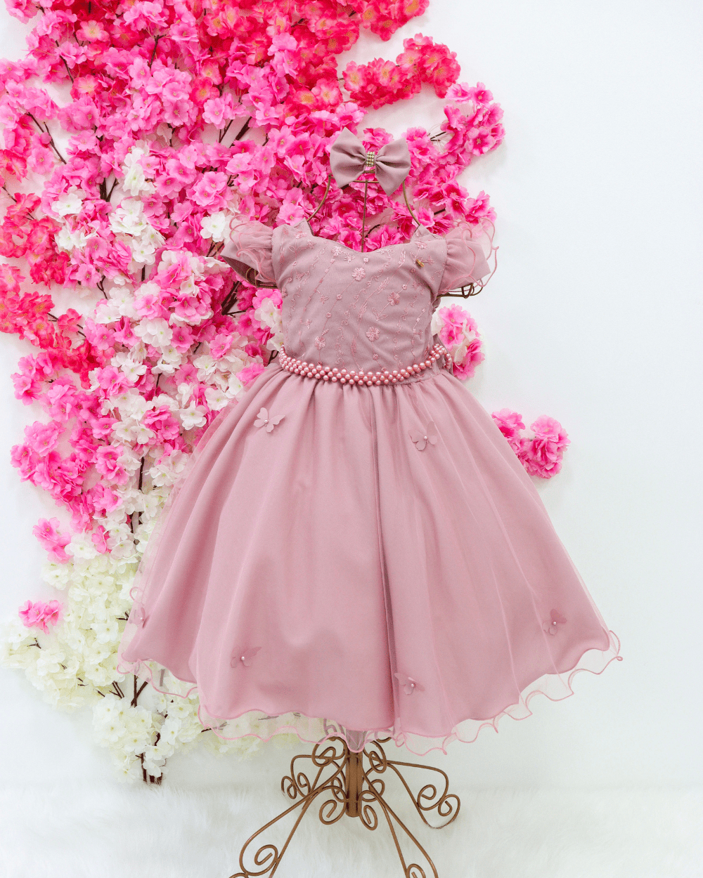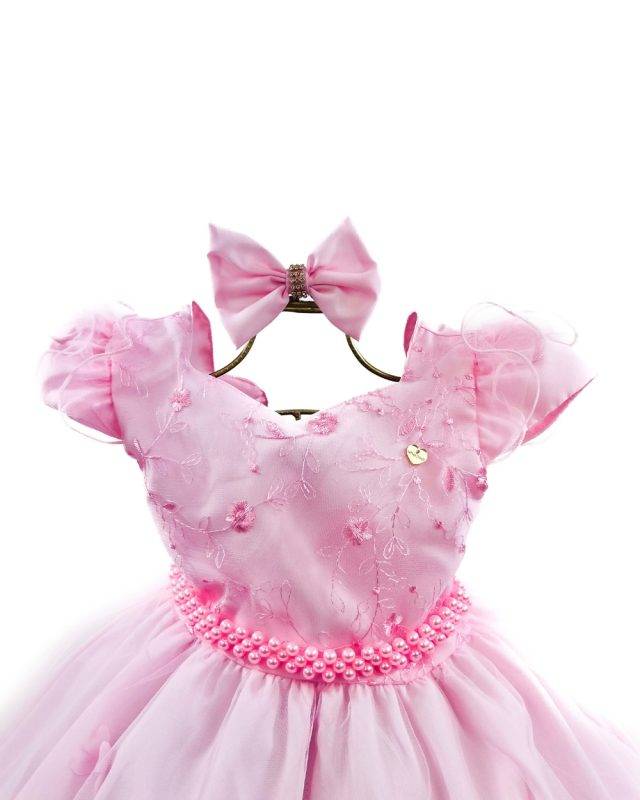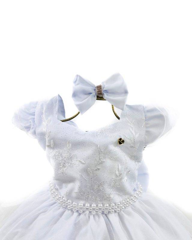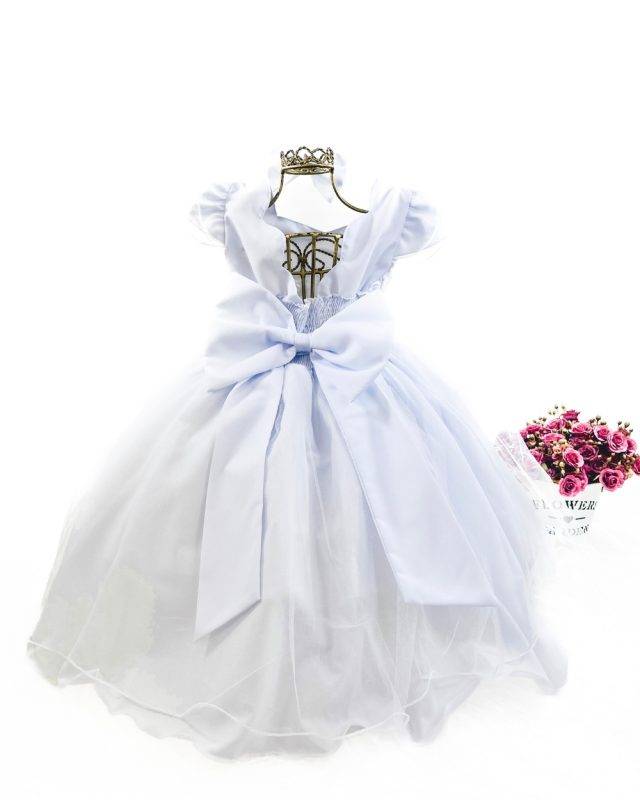 Vestido infantil manga curta , peito rendado , manga de tule, saia lisa de tule . Cintura com pérolas sintéticas. Elástico nas costas ajustável ao corpo.