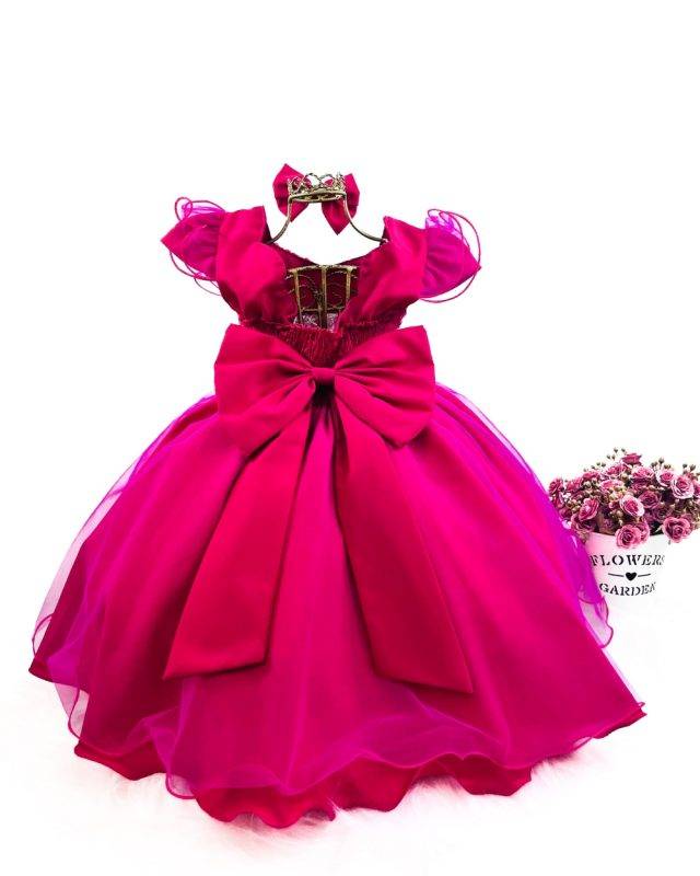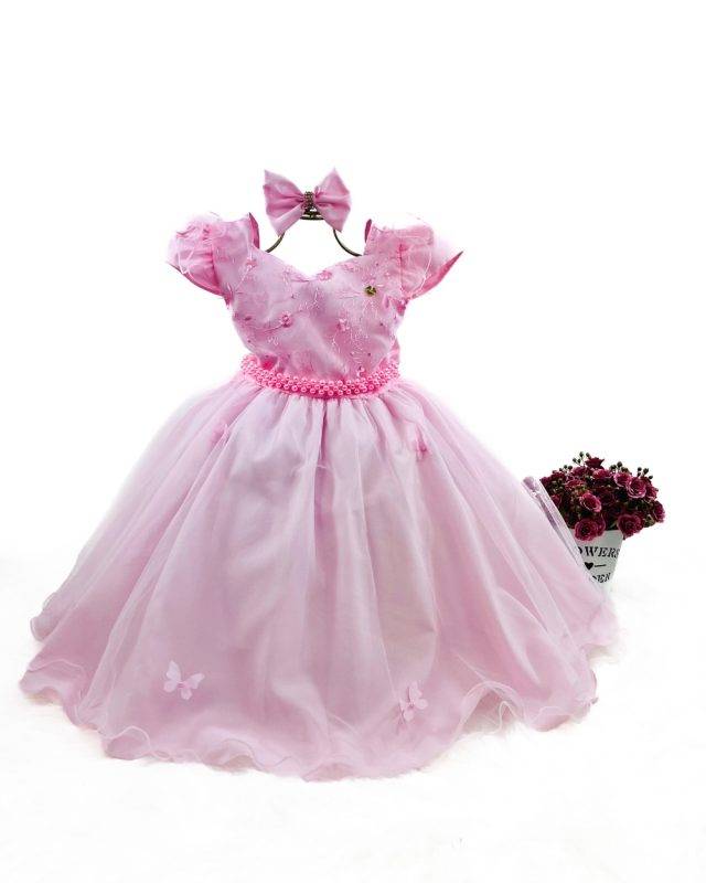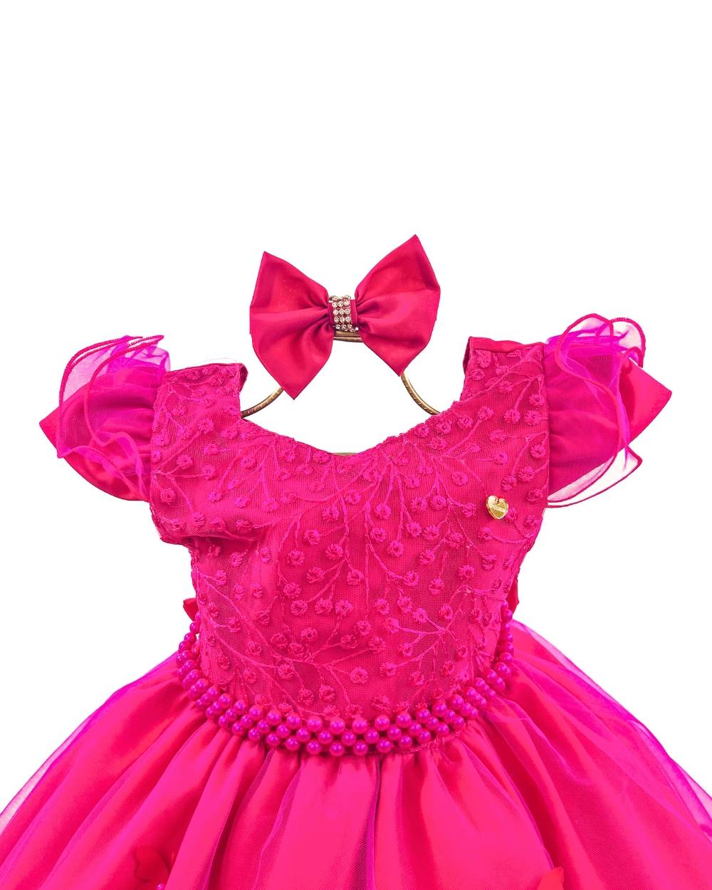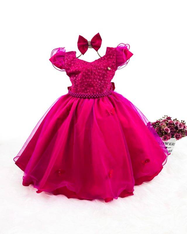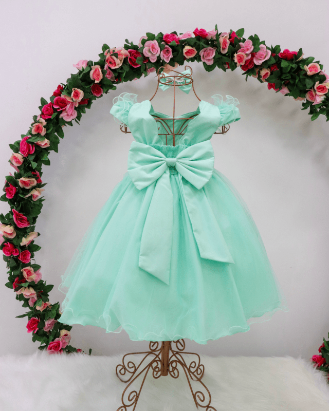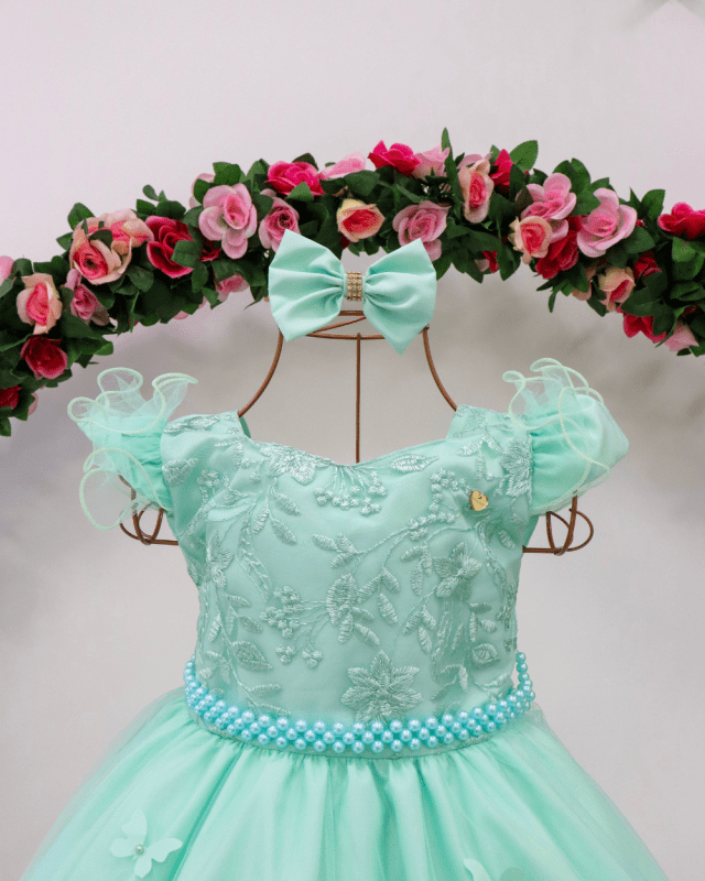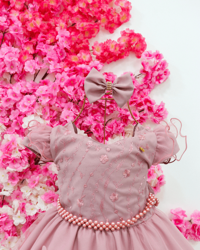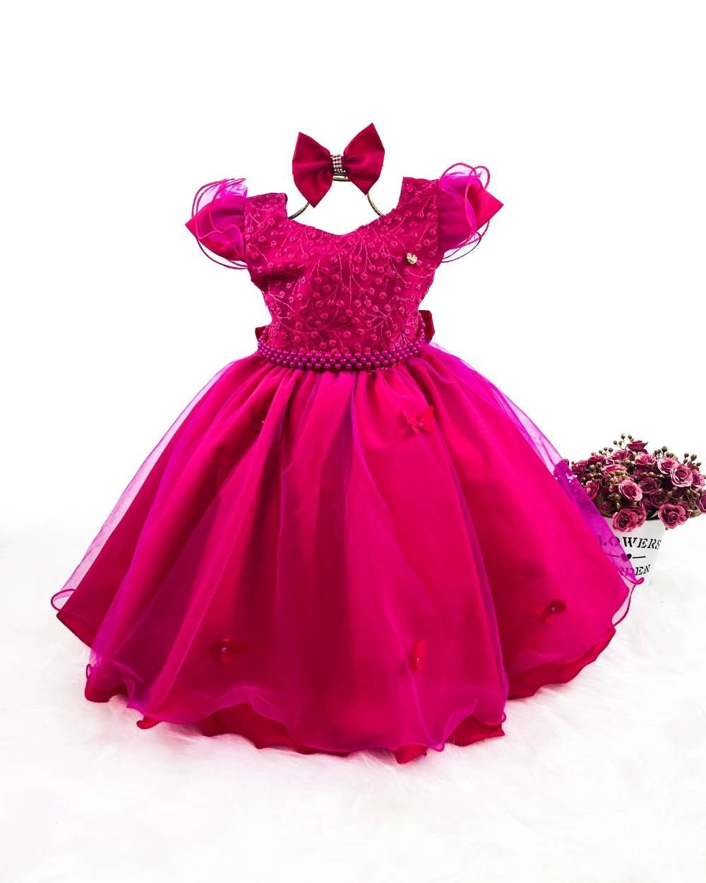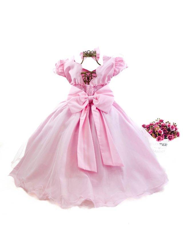 Vestido infantil manga curta , peito rendado , manga de tule, saia lisa de tule . Cintura com pérolas sintéticas. Elástico nas costas ajustável ao corpo.