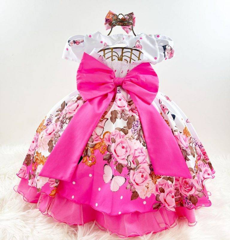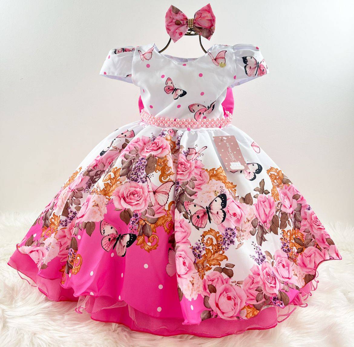 Vestido infantil manga curta, estampa floral com borboletas. Cintura com pérolas sintéticas, saia com acabamento de babado, elástico nas costas ajustável ao corpo e laço. Acompanha 1 bico de pato